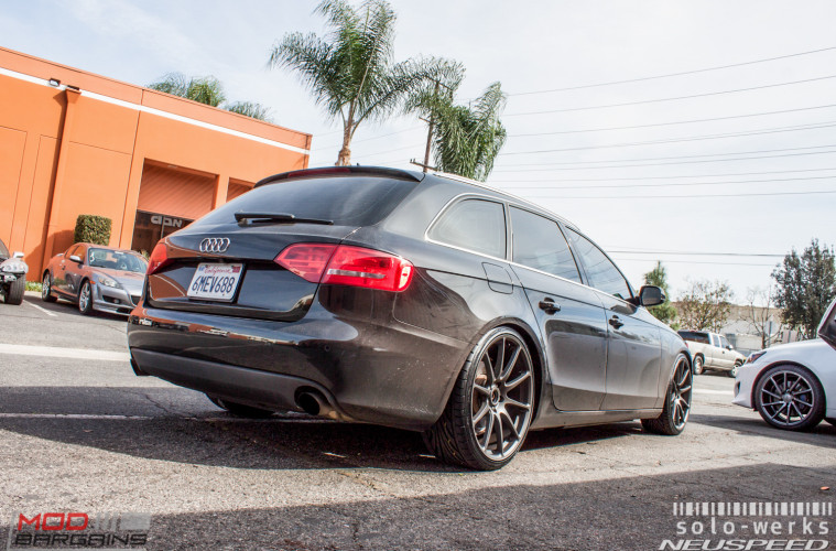 In the USA, Wagons don’t exactly get a fair shake – the American station wagon died off in the 1980s with the advent of the Minivan, but across the Atlantic, the Europeans have been making fantastic longroof cars for decades. Audi’s design game is strong with their line of estate cars, and the B8 Audi A4 Avant is rather sharp looking. The trouble is, the factory ride height and wheels make this sleek 5-door as frumpy as the Lingerie section of Drapers and Damons. Chris C owns this A4 Avant, and brought his wagon in to see Mod Expert Sean to address the boring stock wheels for B8 Audi A4 and to lower the B8 Audi A4 suspension to eliminate the excess wheelgap.