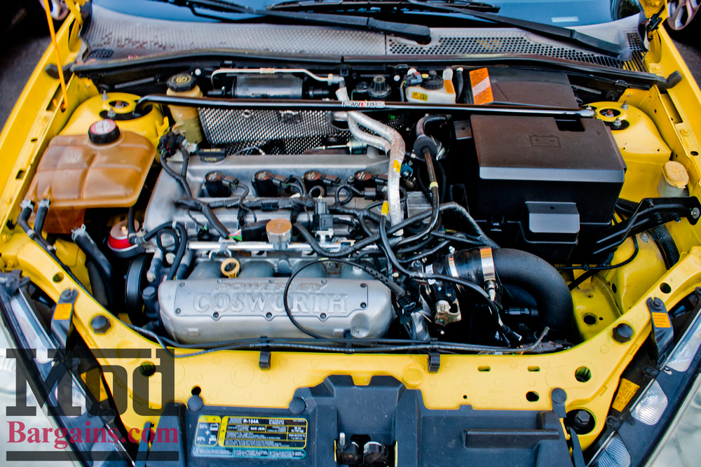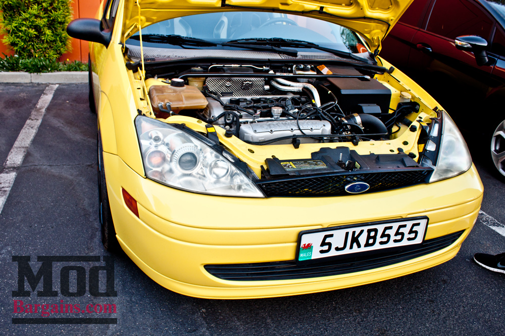 This bright yellow Focus ZX3 is a bit more than meets the eye – popping the hood reveals the Cosworth intake and large aftermarket turbo setup.