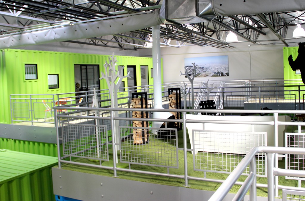 The entire interior seems to be like a fusion of someone’s home, an office, a Scandanavian sensibility and eco-conscious design. Each of his 10 or so full time staffers work in offices housed in cleverly stacked shipping containers, giving the office an easily movable or expandable modular design.