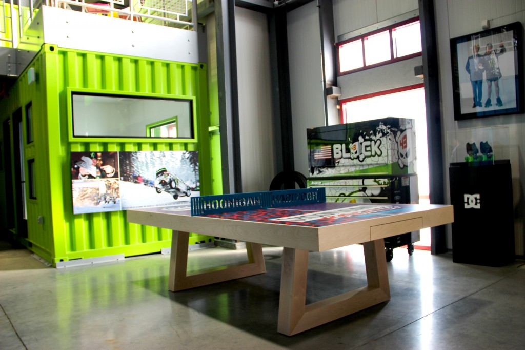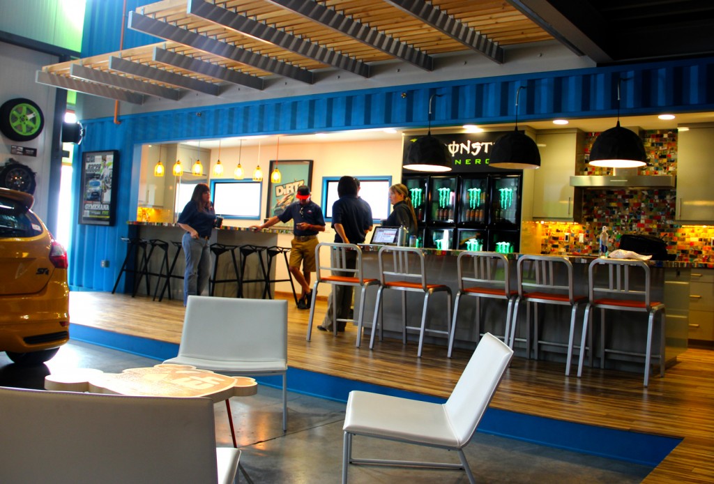 A Ken Block edition Focus ST sits in the lobby, slammed with Fifteen52 Tarmac 5-spoke wheels for Focus ST, Ken Block logos, Ford Racing Exhaust System developed by Borla– indeed, it does clearly represent Hoonigan the brand with bright 80s-esque color splashes everywhere, pieces of rally cars proudly hung on the wall like fine art. Ken’s office is especially unusual with a patio indoors stretching out from the side of his office, a stuffed bear, chainsaw, fireplace and other bits of Eco design remind you that you’re in the mountains.Next to the Focus ST is a kitchen, which looks like it came out of someone’s very nice house who also happened to REALLY like Monster Energy Drinks.