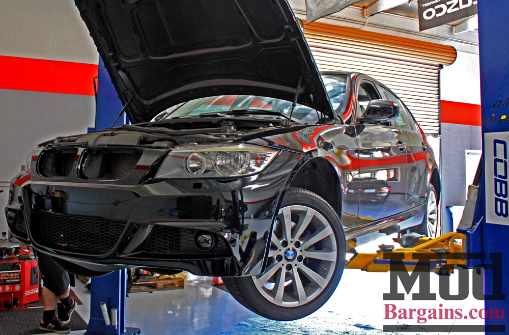 This BMW E90 328i was fitted with the M-Sport aka MTech front bumper for E90, which we replaced. Our M-Sport bumper kit was a great choice because our aftermarket bumpers include all the little things you need to go with the bumper, like the lower grilles. After removing the damaged OEM bumper, we installed a freshly painted replacement bumper, painted right here at Mod Auto. We offer this service exclusively to SoCal customers because of the difficulty of shipping painted parts, but mainly because paint shades tend to change over time, so it’s best we have the car in person to ensure the paint matches.
