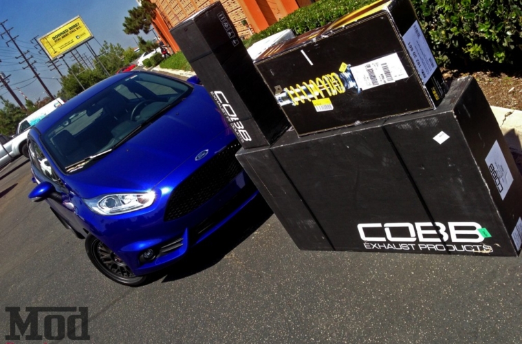 We had quite the stockpile of parts for our Fiesta ST – we laid them out by order of where they’d go, the COBB Front Mount Intercooler for Fiesta ST in the box by the bumper, the coilovers marked, the Cobb Fiesta ST Downpipe in the skinny box and the catback comprising the rest of the Cobb Turbo Back Exhaust System for Fiesta ST in the largest box. The shop was booked solid at the time, so being a hands-on type of guy, Nick took it upon himself to evaluate and install the system at home, figuring it’s best to see how the system is for the average enthusiast to install.