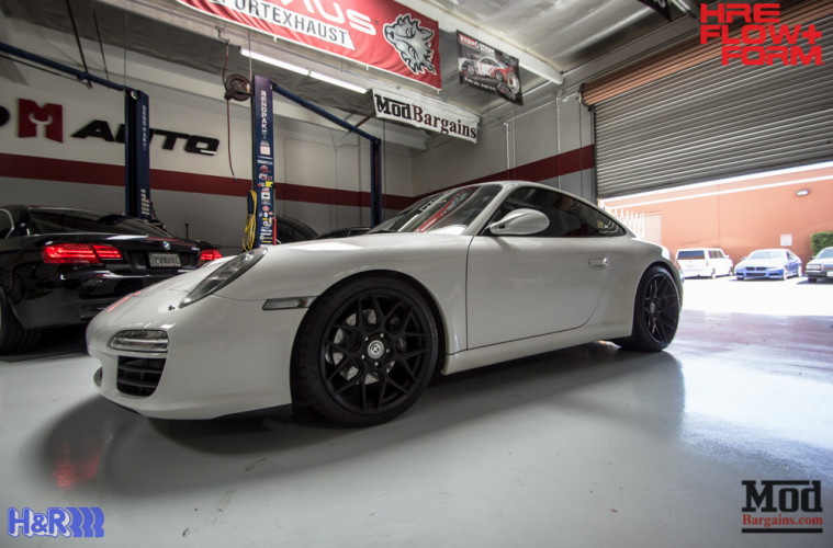 A while back this Porsche 997 Carrera came through the shop to get a bit lower to better fit the gorgeous wheels it rolled in on. Rocking set of HRE Performance Wheels’ new HRE Flow Form FF01 Wheels for Porsche in Tarmac finish, the white paint really makes for a great contrast to the dark details.