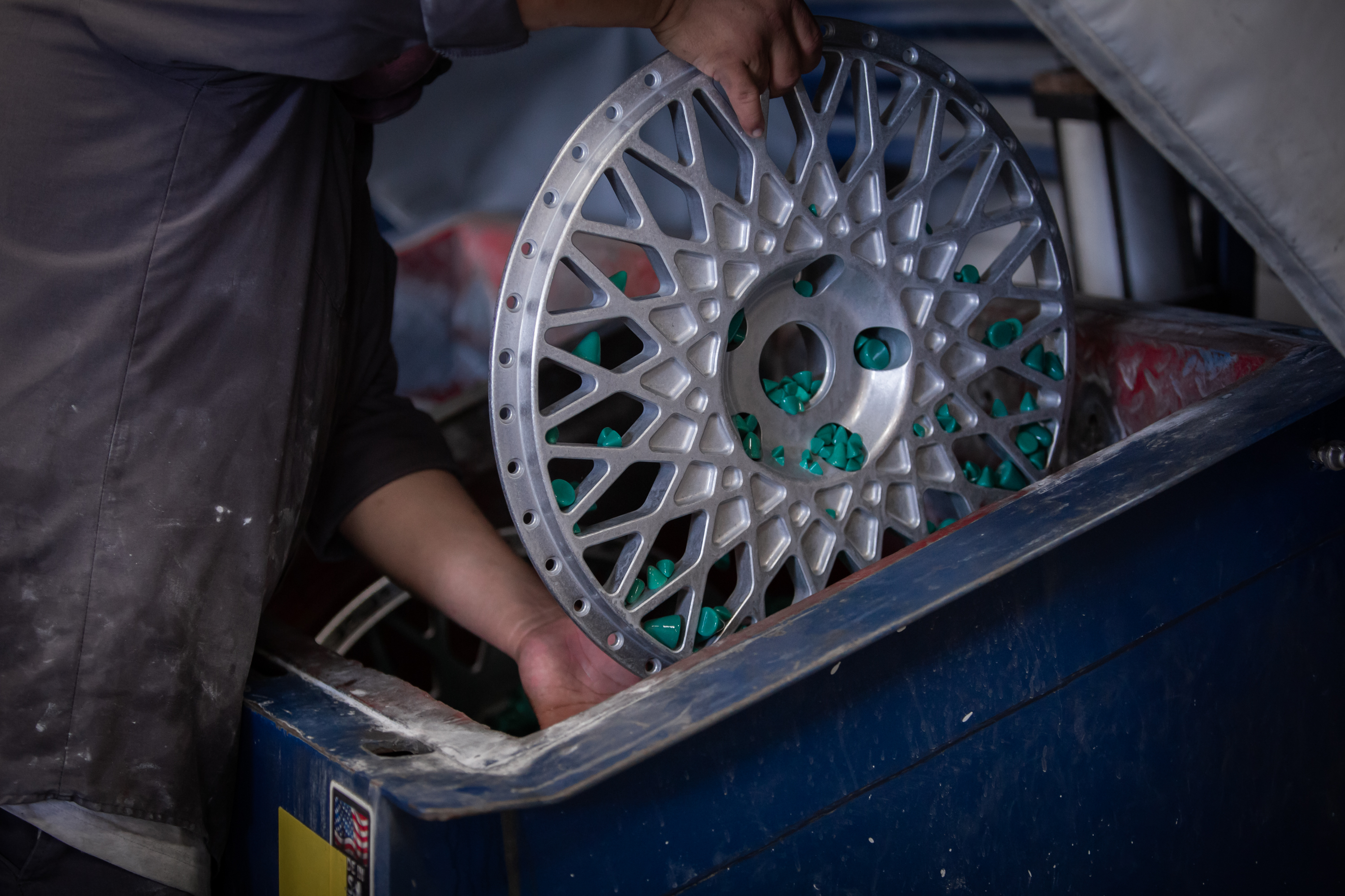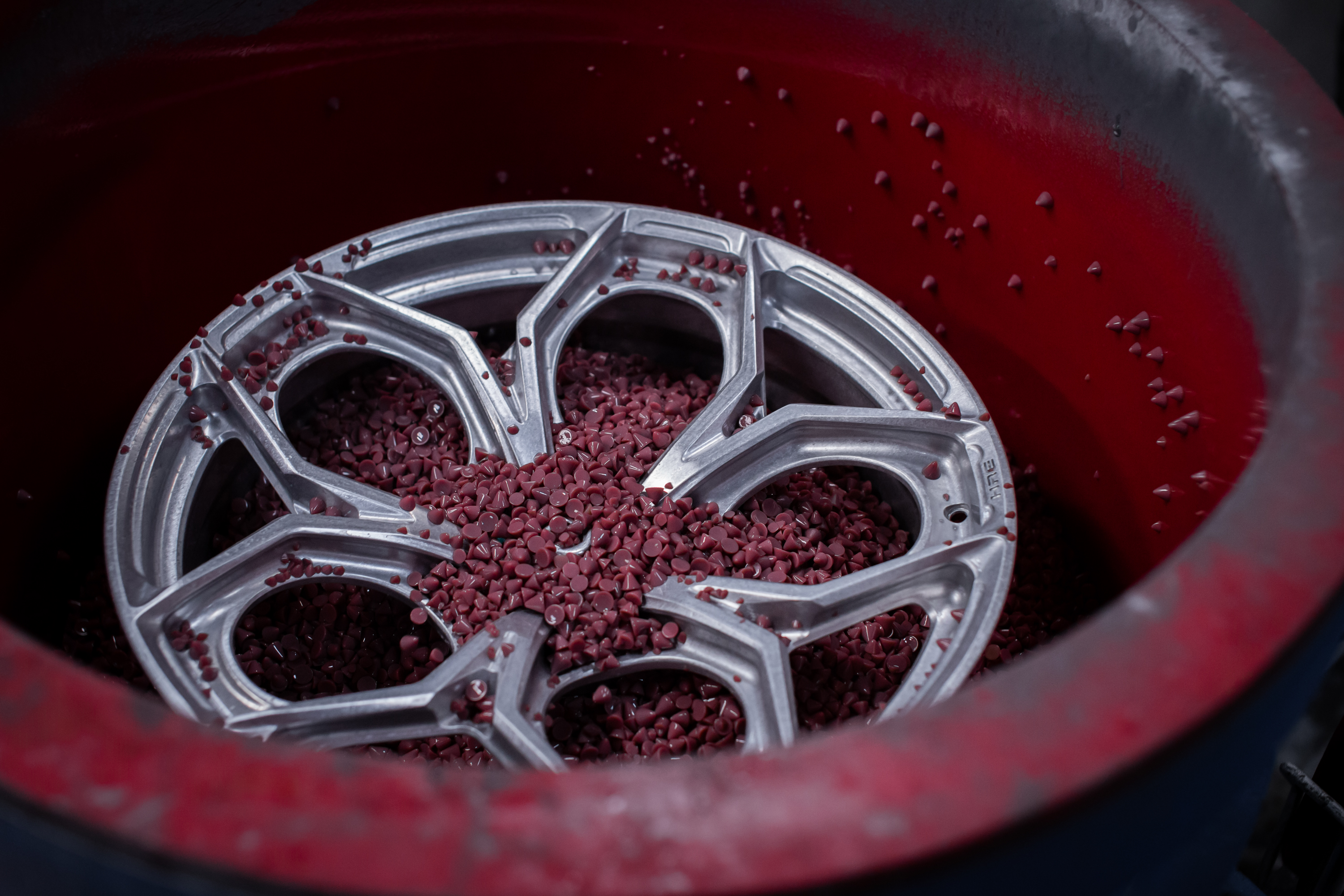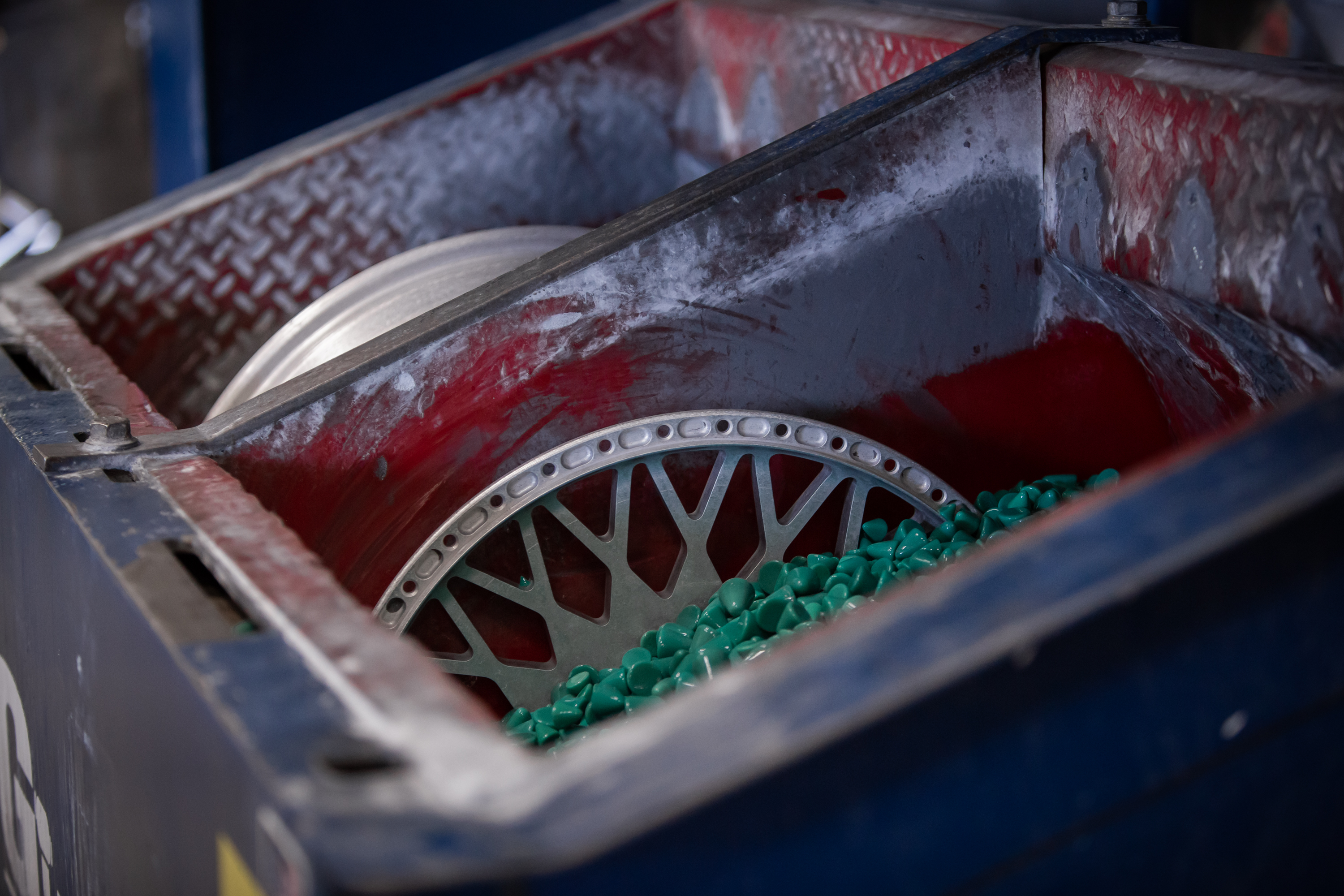 After forging, the aluminum wheels or wheel components are put into vibratory tumblers that contain different sorts of rough, abrasive media. The wheels are submerged in these tumblers and put through cycles that agitate the media against the wheels.