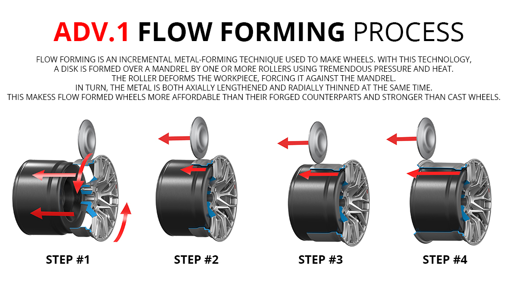 Flow Spec is ADV.1‘s name for flow formed. Flow forming is the wheel manufacturing that takes a cast wheel face and roll forges the barrel to add strength and reduce weight. The process is very popular and turn out a product that is much stronger than traditional cast wheels but cost’s much less than forged.