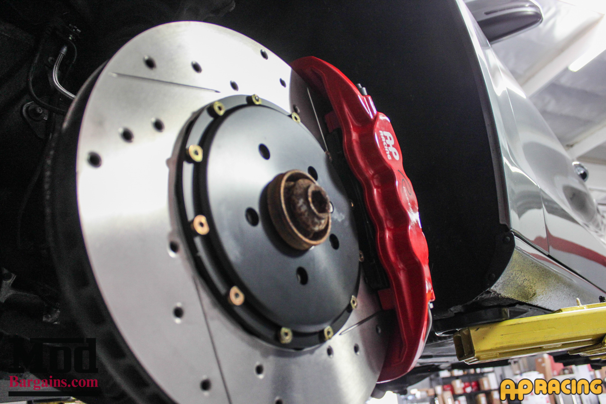 From this angle, you can also see how much fatter the new AP Racing 2-Piece rotor is – all those vanes and wider exhaust vents mean that these discs cool much more quickly.