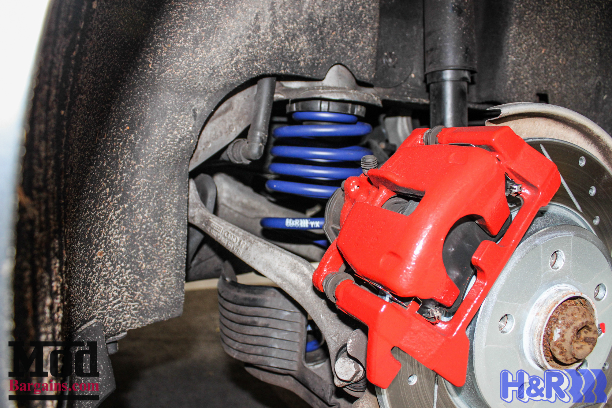 Here’s how the rear springs look installed, and even after a few weeks of use, the bright painted calipers and drilled and slotted rear rotors still look great.