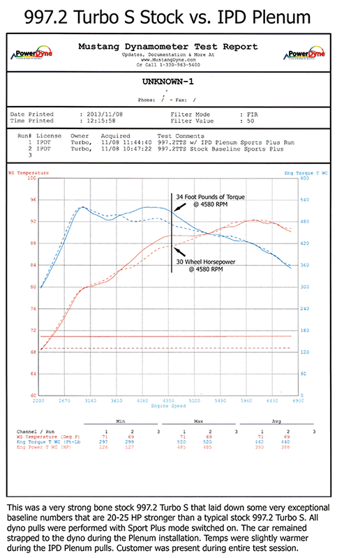 Given that the car remained strapped to the dyno for the duration, both before and after the installation, heat soak would be expected to dampen the output, right? Even warm, the plenum itself yielded a major gain across the entirety of the rev range.
