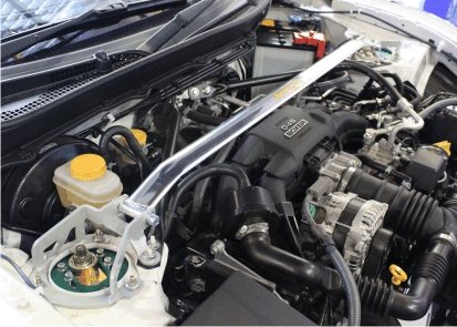 There are a wide variety of options available depending on your budget, style, taste, brand preference and how much underhood clearance you actually need. Cusco offers a fine set of Front & Rear Strut Tower Braces for Scion FR-S/Subaru BRZ [ZC6/ZN6] that are the classic 2-point style, tying the tops of the suspension together preventing suspension deflection under load.