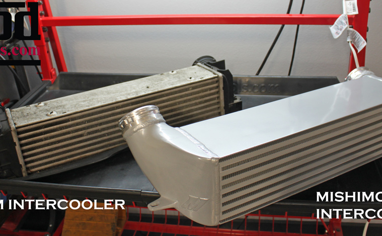Side by side with the OEM intercooler, the difference in size and volume between the Mishimoto FMIC and the OEM one are clear. In fact, the core of the Mishimoto Intercooler is so dense, it’s surprisingly heavy – one of the few times adding weight to the car significantly enhances performance, and the thick core means lots of additional cooling capacity.
