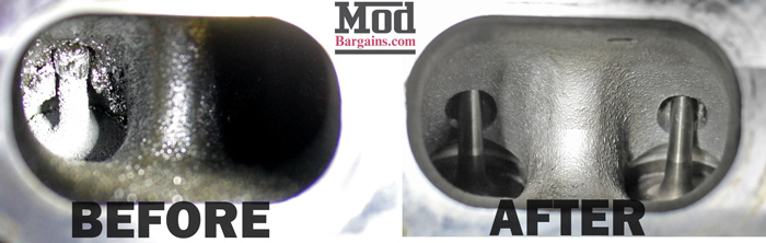 Here’s a closeup of an intake port before and after the service. On the left, you can see there’s a thick coating of crap on the intake valve, gumming it up and hampering performance and response. Now check out the intake port on the right – looks brand spankin’ new – and performs as such.