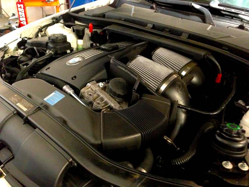 Complimenting the tune is an aFe Stage II Intake System for E90 BMW 335i, which lets that N54 breathe better – and lets you enjoy the sweet engine note of that inline six unfiltered. The OEM airbox is more than a little restrictive – this upgraded N54 cold air intake for E90 BMW 335i from aFe is good for 27HP and 34lb/ft of torque (these are huge gains for an intake – around double what most intake), with the added bonus of actually improving fuel economy by 1-2mpg. The nice thing about this intake is that it mounts using the OEM mounting points and looks totally at home under the hood – like it always should have been that way.