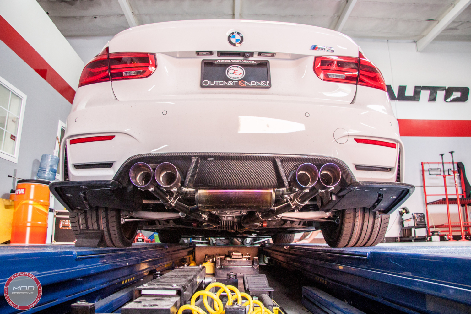 This car boasts a suite of modifications manufactured by Outcast Garage, including this OG Exhaust for F80 M3, the Carbon Fiber Diffuser and the Carbon Fiber Rear Splitters.