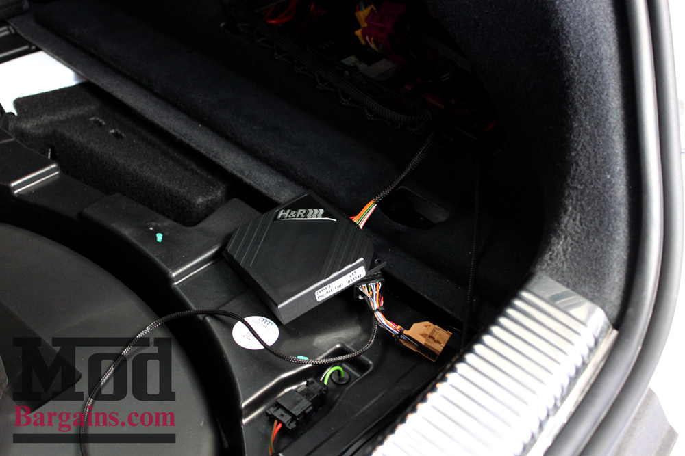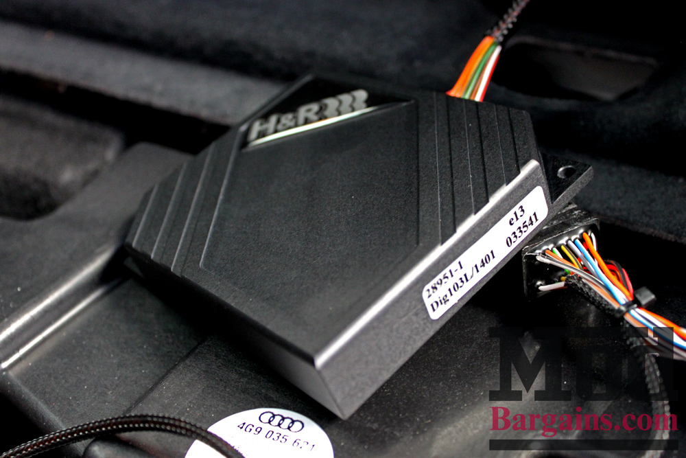 Instead of dismantling the suspension – or even removing the wheels, we just pop the trunk, peel back the carpeting and a few trim pieces, and connect our H&R Suspension Audi lowering module for Audi A7 Suspension.