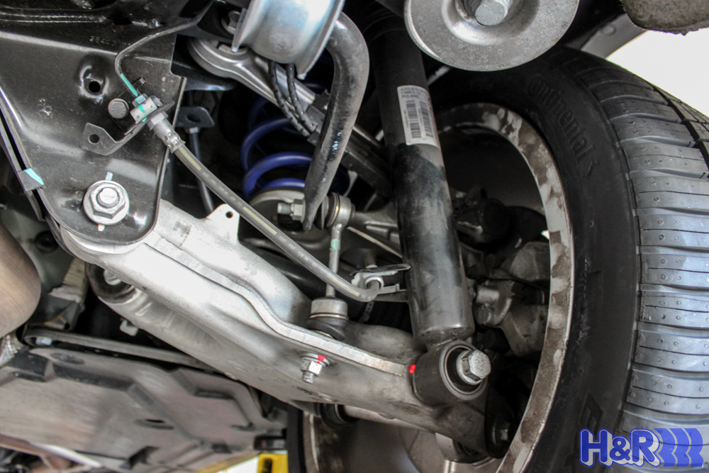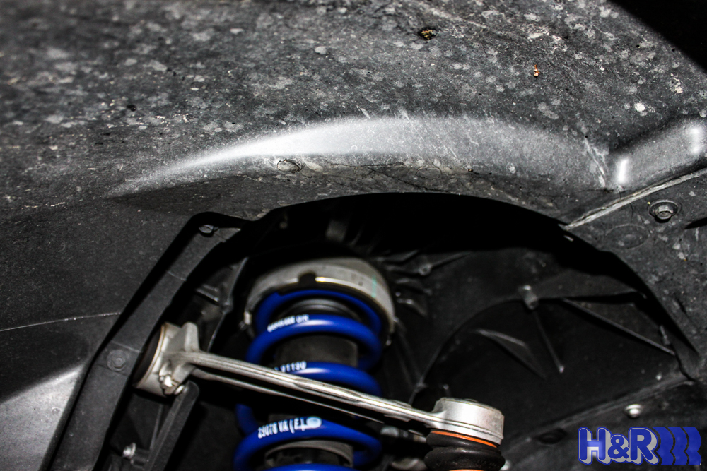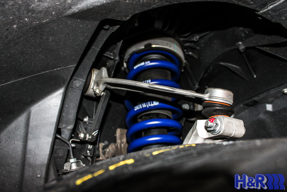 We installed a set of H&R Sport Springs for E70 BMW X5, which drops the X5 a whopping 2.0in up front and 1.2 in at the rear, giving the car a better look and much better handling performance. In the shot above, you can see how the front springs fit into the X5’s suspension.