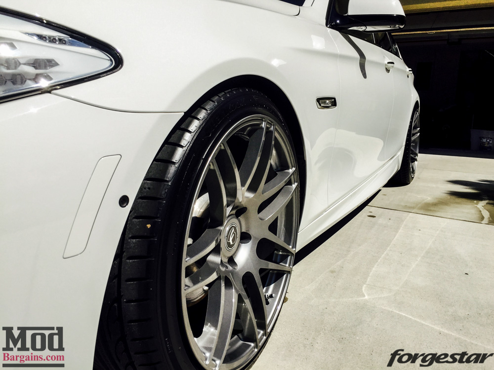 The Mod Experts had just the thing in mind. Given the big body of the F10 5er, a larger diameter wheel was just what the doctor ordered. A set of Forgestar F14 Wheels for BMW in 20in diameter was the prescription for freshness, 20×9 Deep Concave up front, 20×10.5 Super Deep Concave in the rear – big wheels to match the bigger 5.