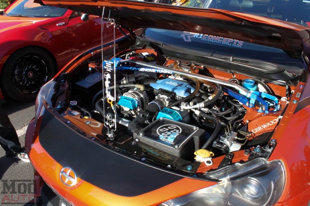 It’s hard to make out in the photo but the FR-S in this photo is fitted with a 2″ widebody setup – this FR-S has enough mechanical grip to darn near drive on the ceiling – the Forgestar F14 Super Deep Concave Scion wheels are wrapped in 335-series tires wide as Montana… 335s on an FR-S! Now I really have seen everything.