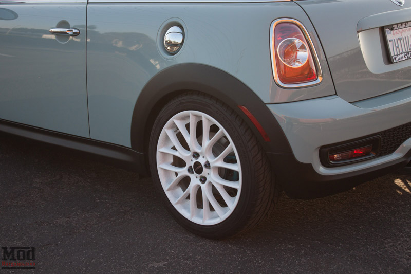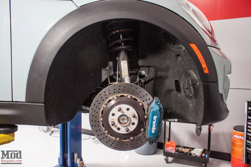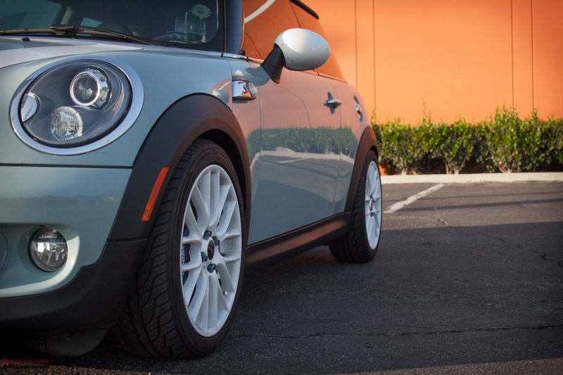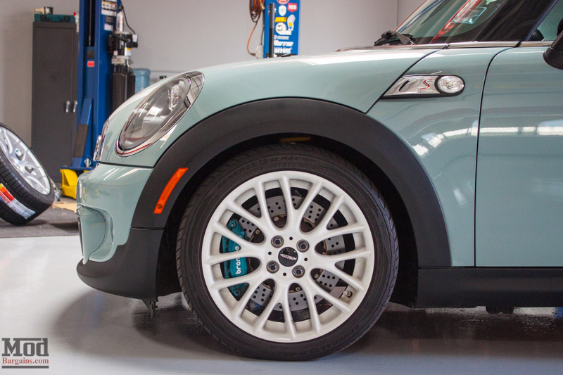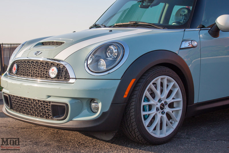 Up front, you can see that this Mini is a whole lot more than just “cute” with that Brembo big brake kit peeking out from behind the JCW wheels. It’s one of this Mini Maven’s favorite parts of the build!