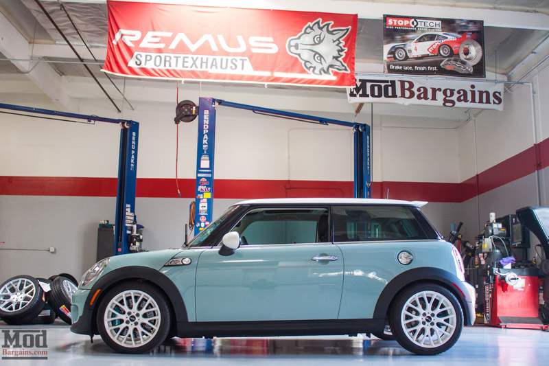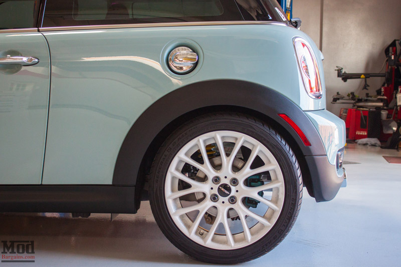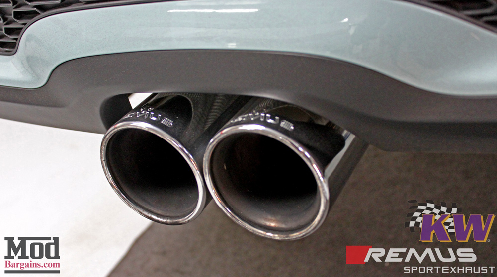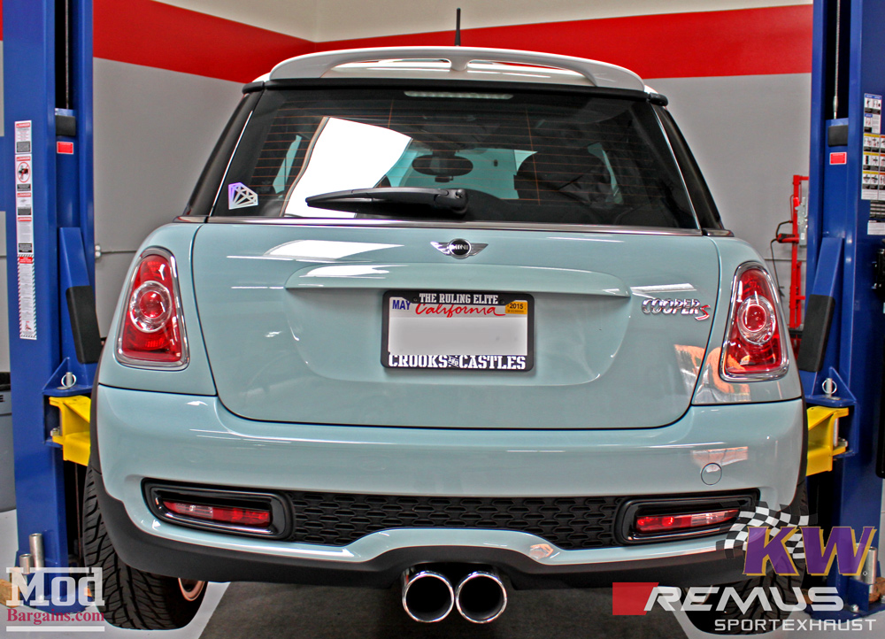 From this angle we can better see the KW Coilovers installed in the rear, as well as the Remus Exhaust for R56 Cooper S that’s been fitted to this S.