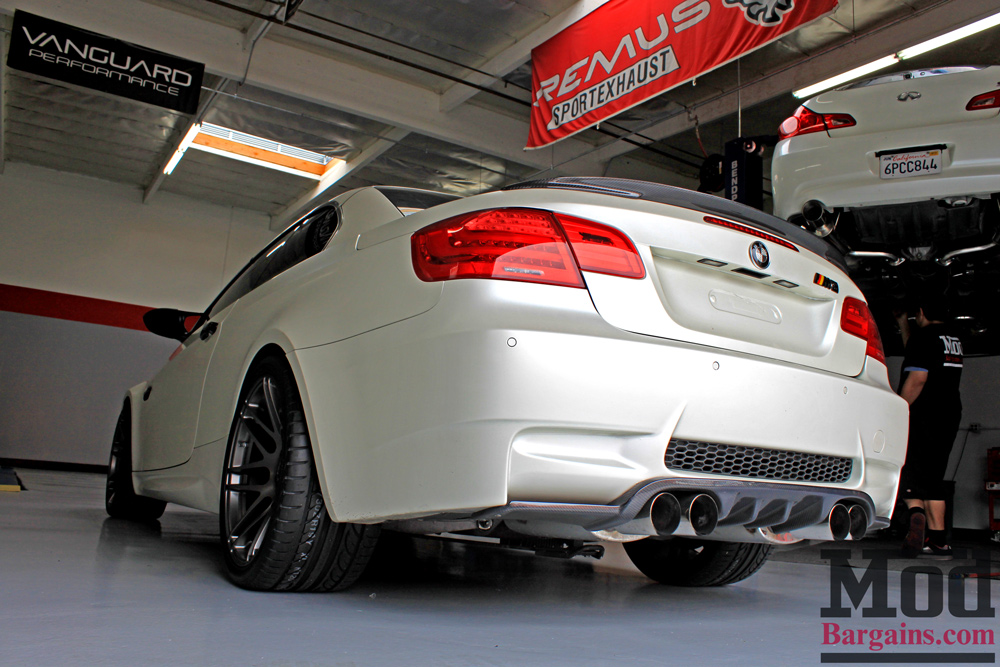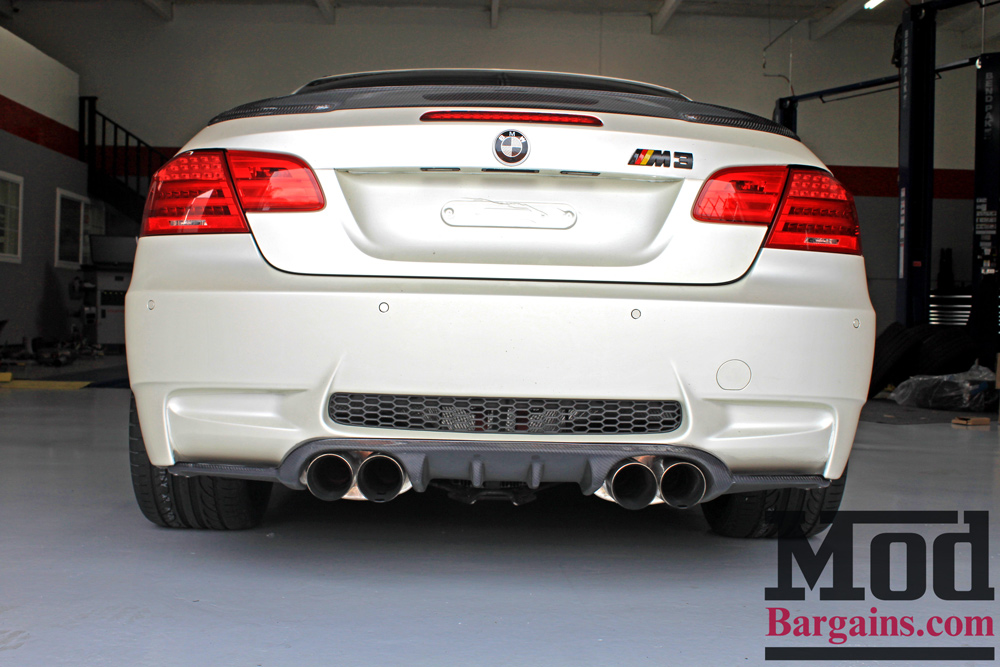 Out back a Performance Style Carbon Fiber Trunk Spoiler for BMW E93 Cabrio rounds out the carbon aesthetic, tying into the CF details on the front of the car as well as the H-Style Carbon Fiber diffuser for E92/E93 BMW M3.