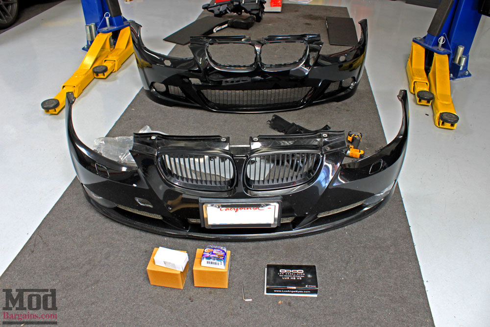 We had the front bumper off before you could say Bob’s your uncle. Here’s how the old bumper looks set up next to the new one. We weren’t stopping with just changing the bumper on the front end either, we also had some lighting upgrades for BMW E92 in store.