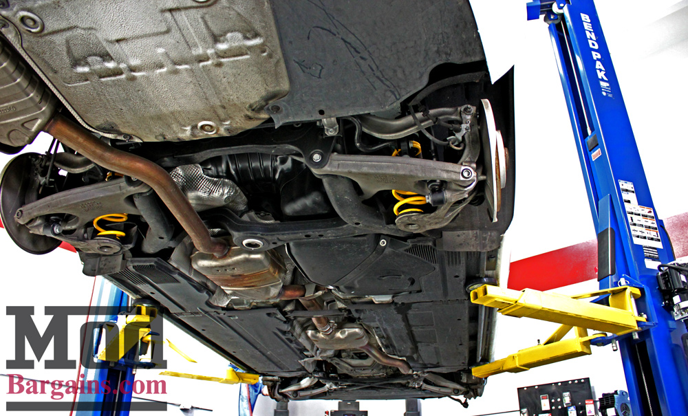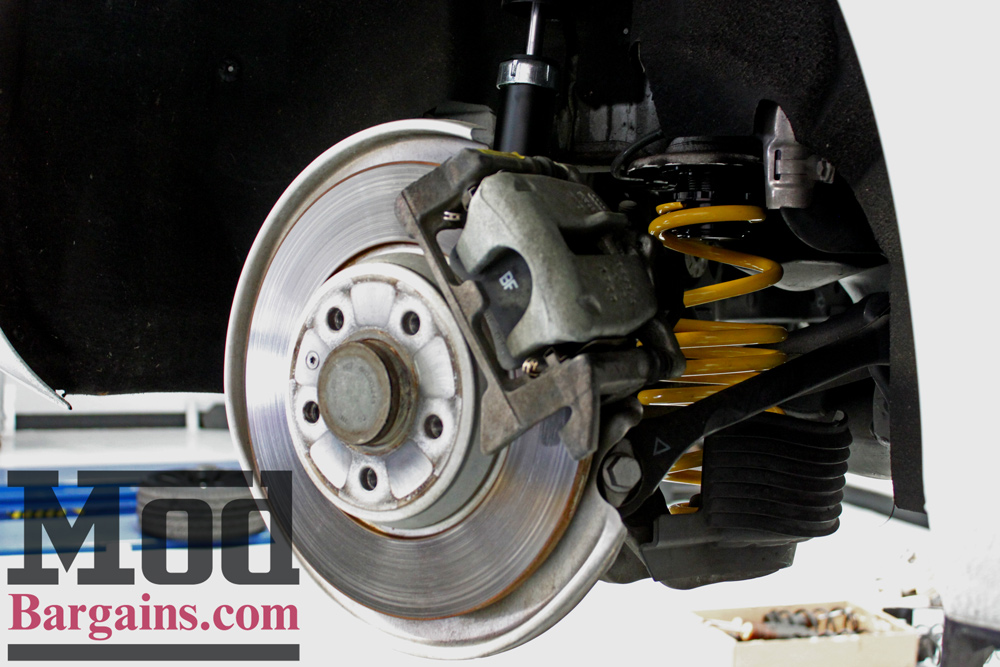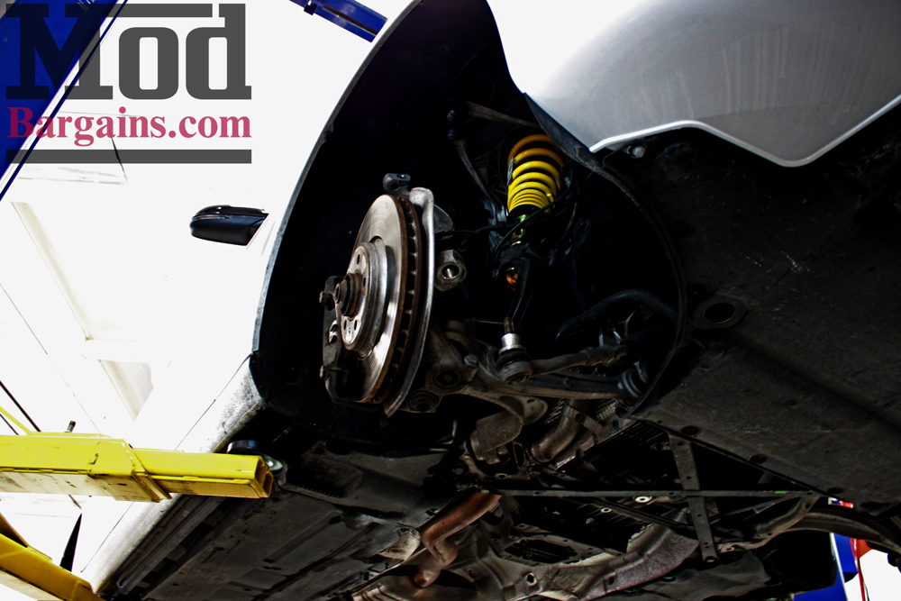 Given how many sets of coilovers we install, any week of the year, our experienced techs made quick work of installing the ST’s. Of course, once the wheels are back on, the coilovers are all but impossible to see, so we had to snap a few shots before the guys had everything put back together so you can see how it all fits together.