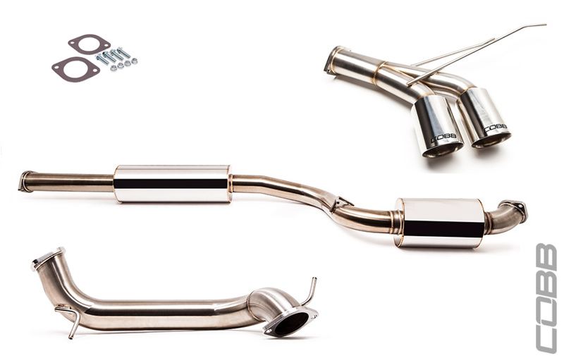 Let’s start with some features: The COBB cat back (catalytic converter to exit) 3” exhaust system was built for performance. The system uses 304 stainless steel. All mandrel bends were done on a CNC controlled bender, which provides minimal flow restriction and perfect fitment of each unit. All flanges and hangers are TIG welded for strength and for a clean appearance. The mandrel-bent 3in exhaust tubing is combined with a set of custom inline mufflers and a dual 4” tip that is polished and etched with the COBB logo.