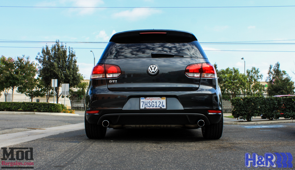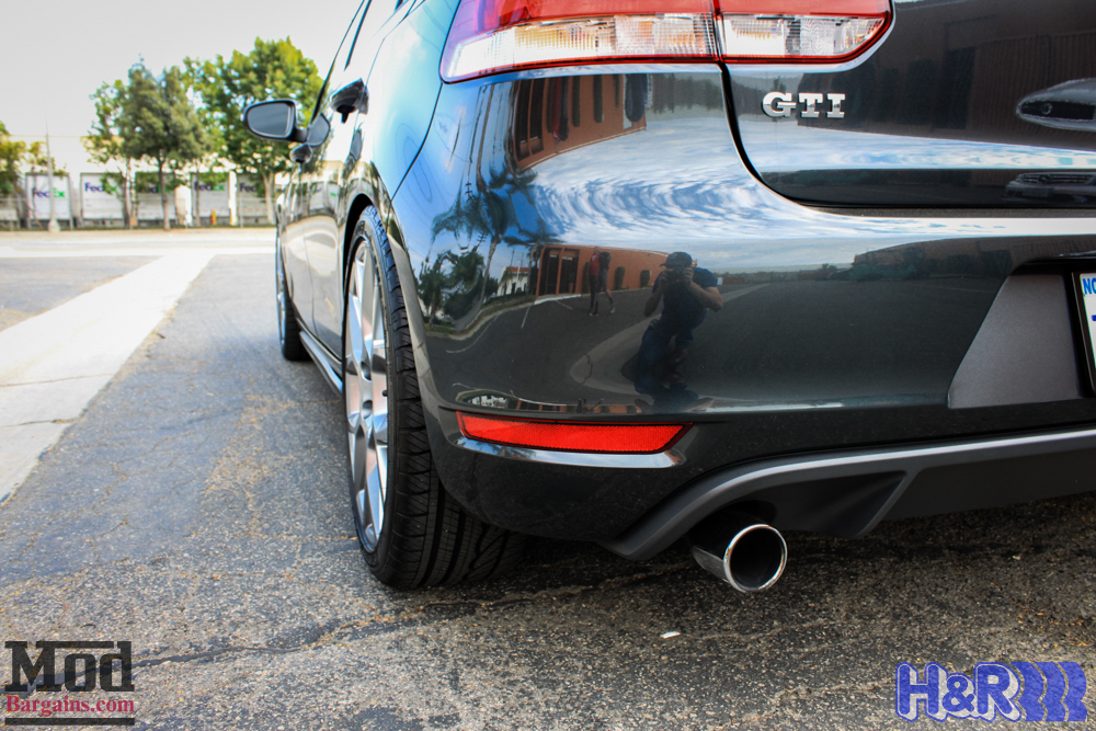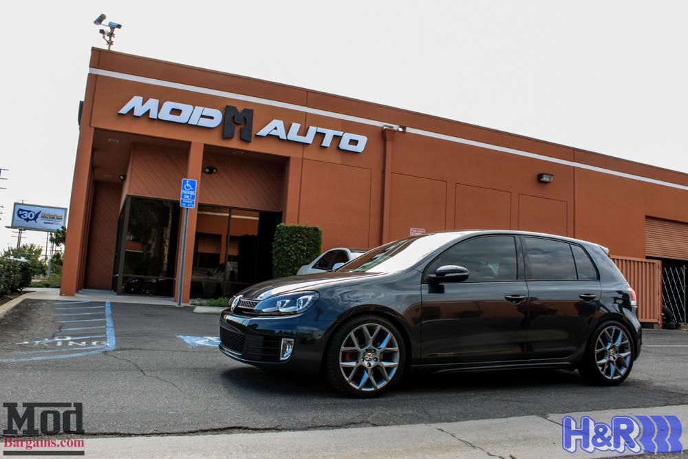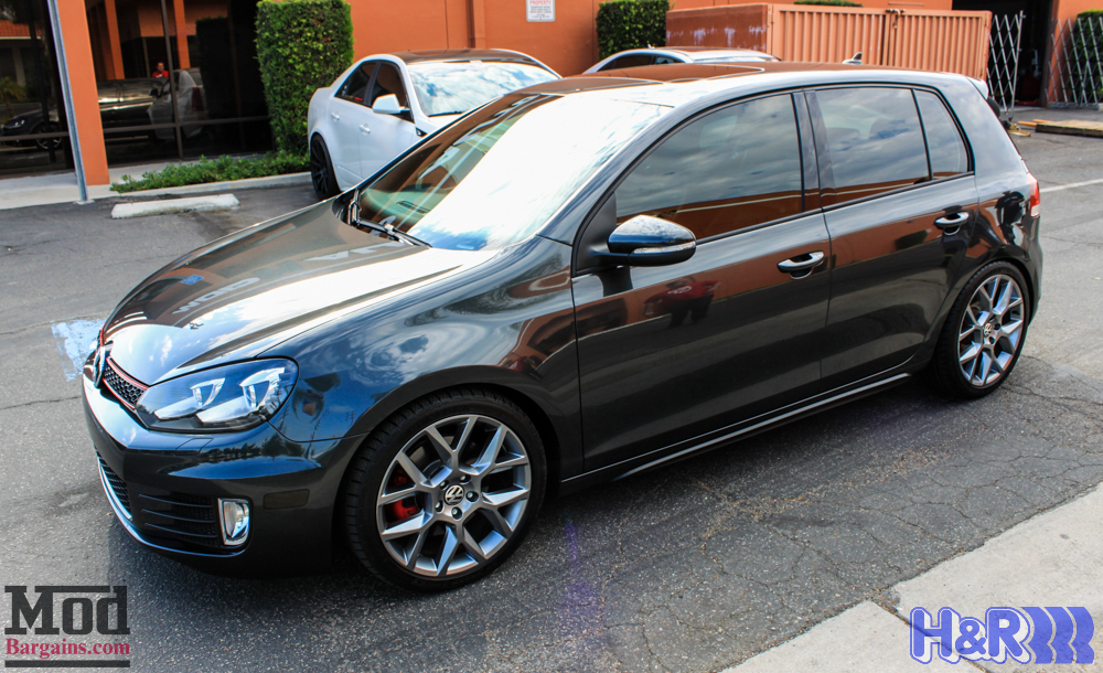 H&R Suspension‘s motto is “GO WIDE”- and a few days back Richard W’s bone stockĀ 2013 Volkswagen Golf GTI Mk 6 got the full H&R treatment installed at ModAuto with a bit of help from Mod Expert Blake.VW_Golf_GTI_MK_VI_HR_Cup_Kit_Spacers-11One of the first mods most people do to any car and give it a drop – and drop it we did with a full H&R Suspension Touring Cup kit for VW Golf GTI Mk VI, featuring H&R Springs and H&R’s own shocks/struts, which brings down the ride height of the car 1.2in both front and rear, giving the car a healthy drop.