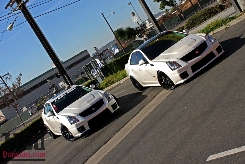 Both Mike and Hunter have pearl white CTS-V Sedans with a build tailored to each of their tastes. Hunter’s CTS-V already sported some Exterior Upgrades for CTS-V like a Carbon Fiber front Lip and Rear Spoiler for Cadillac CTS-V. The massive OEM Brembo Brakes have been powdercoated a brilliant green that stands out from the otherwise restrained look of the Cadillac – a set of performance wheels for Cadillac have started the custom look, but those wheels, doesn’t quite look right with the stock CTS-V Suspension. Mike’s CTS-V is already lowered, and Mike’s positive experience living with these springs for over a year made it easy to recommend Eibachs to a friend.