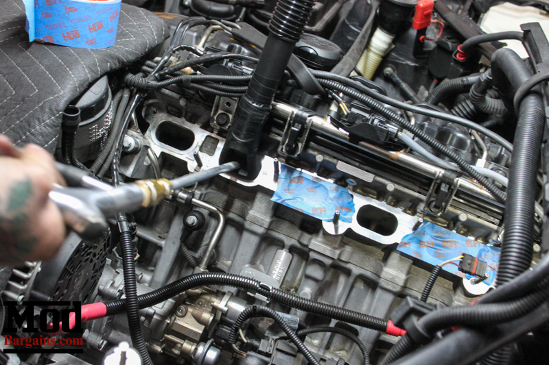 The Intercooler is a critical mod for every single BMW 335i – the OEM intercooler is undersized and if you want more power out of the car, the intercooler is one of the key components that allows you to step up to more aggressive mapping. Matt T went with a Mishimoto Front Mount Intercooler, which we mentioned a few weeks back in another feature. Deceptively heavy, this dense core Mishimoto FMIC for BMW 335i offers some of the best cooling capacity for the E90/E92 platform, offering 35*f reductions in air charge temperatures and right out of the box yields a 20whp increase, and will be a huge supporting player in concert with your other modifications.
