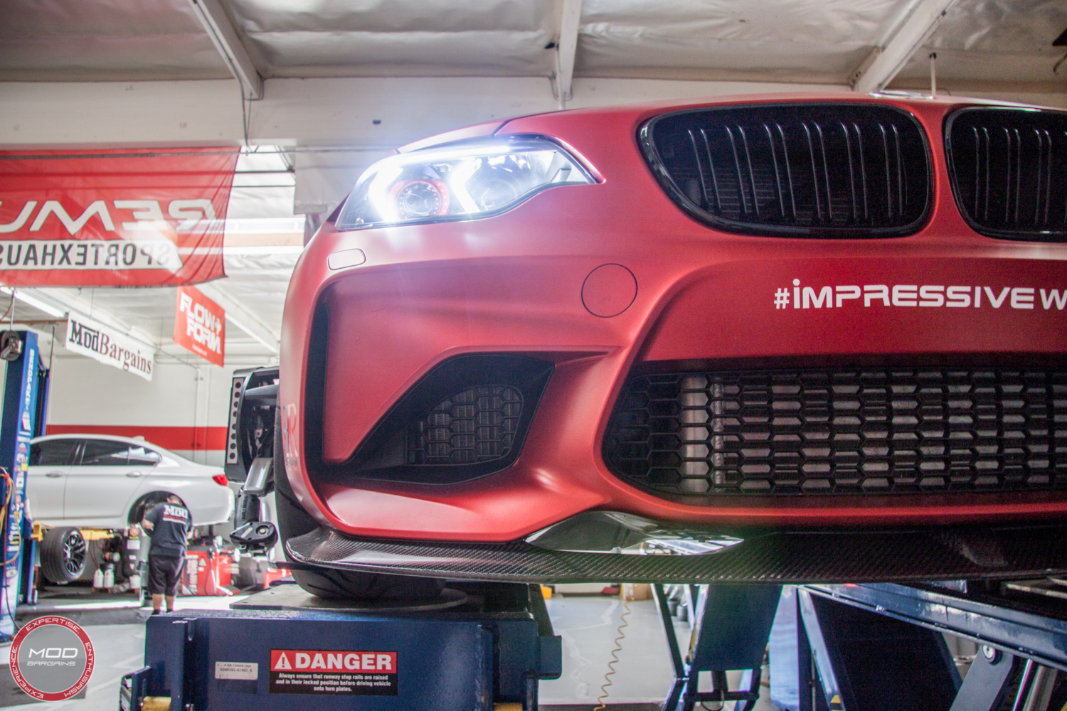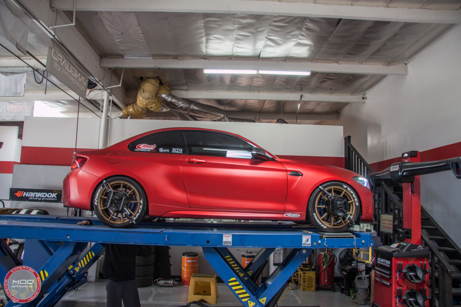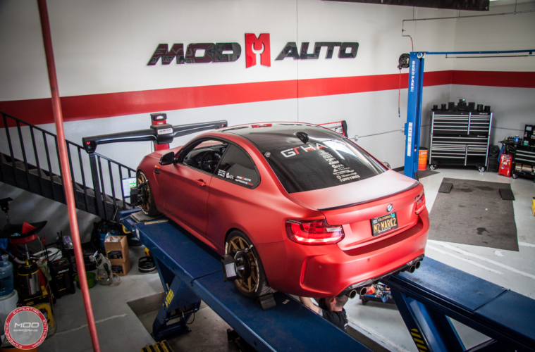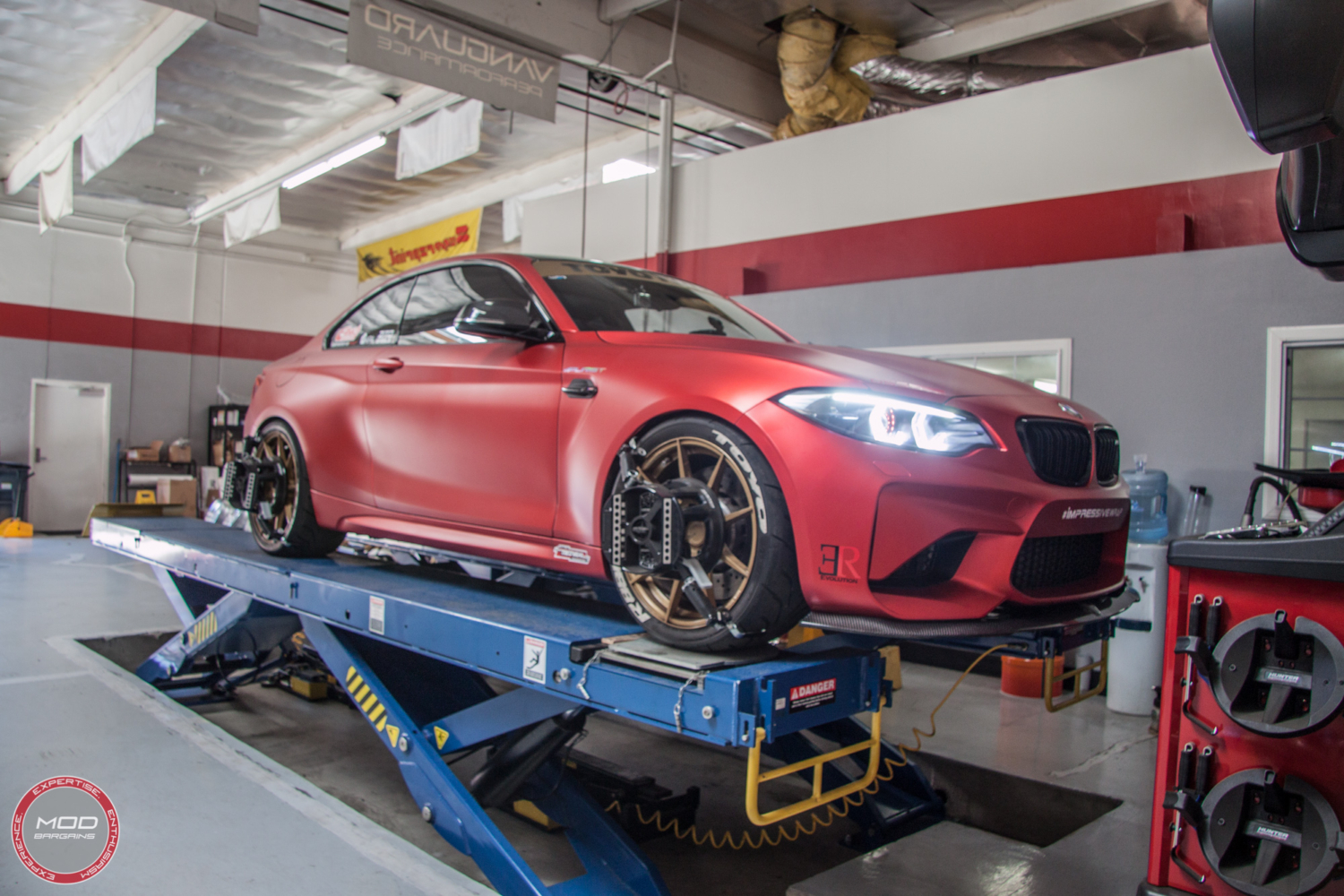 At ModBargains install facility, ModAuto, we have quite possibly one of the best alignment rigs in the entirety of the southern California region. Our extremely lowered-car friendly Hunter Alignment rig in conjunction with our flush-with the floor alignment lift makes us the place of choice for alignments for supercars and custom builds all over the area. Case in point, this gorgeous matte red F87 BMW M2, customized by our friends over at Impressive Wrap.