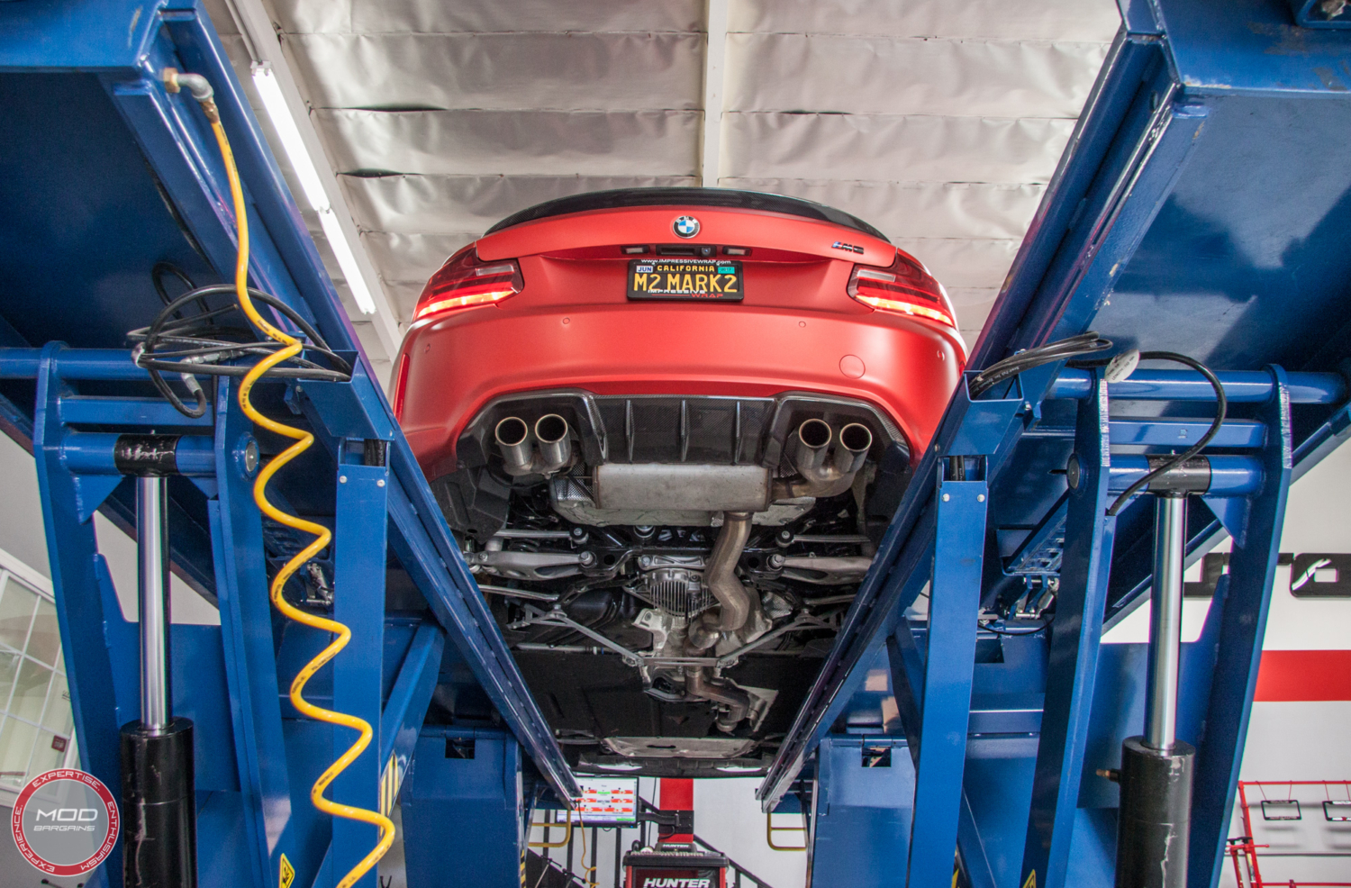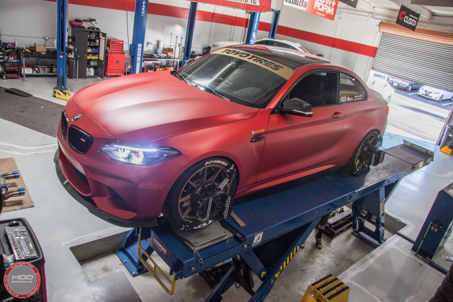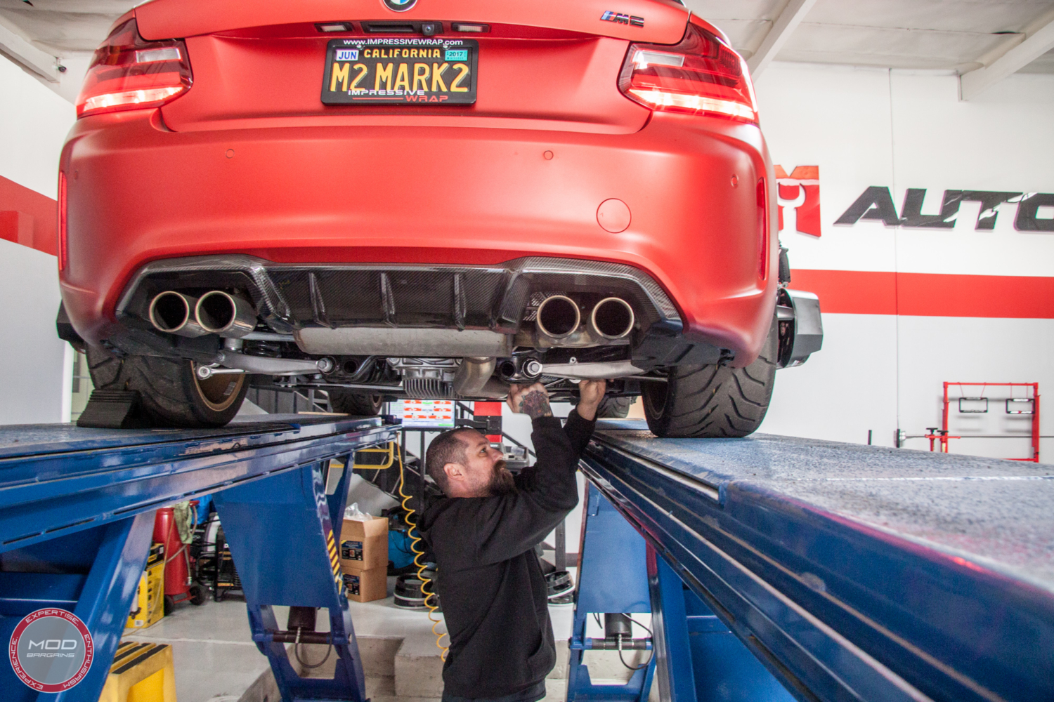 At ModBargains install facility, ModAuto, we have quite possibly one of the best alignment rigs in the entirety of the southern California region. Our extremely lowered-car friendly Hunter Alignment rig in conjunction with our flush-with the floor alignment lift makes us the place of choice for alignments for supercars and custom builds all over the area. Case in point, this gorgeous matte red F87 BMW M2, customized by our friends over at Impressive Wrap.