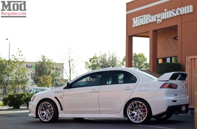 Did you know that we here at ModBargains can also help you out with modifying your Mitsubishi Lancer Evolution or Evolution X? ModBargains can hook you up with the parts- and if you’re local to SoCal, you can have your parts installed right next door at ModAuto. This gorgeous white Evo X rolled through the shop a while ago for a set of new VMR Wheels V710 Rims. The sporty design of the V710 is a great compliment to this street shark’s styling.