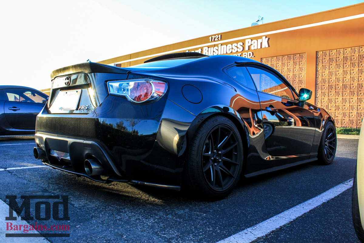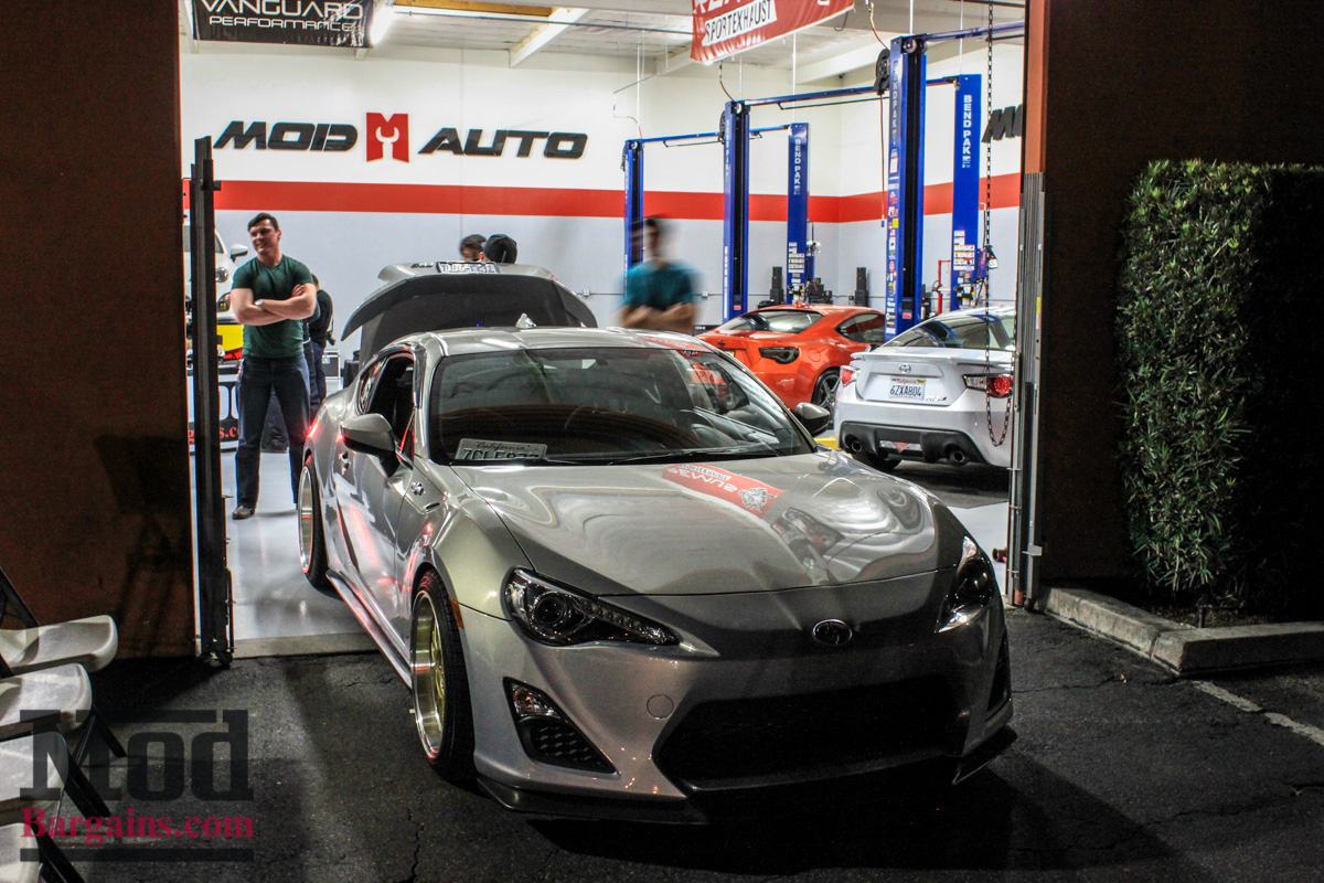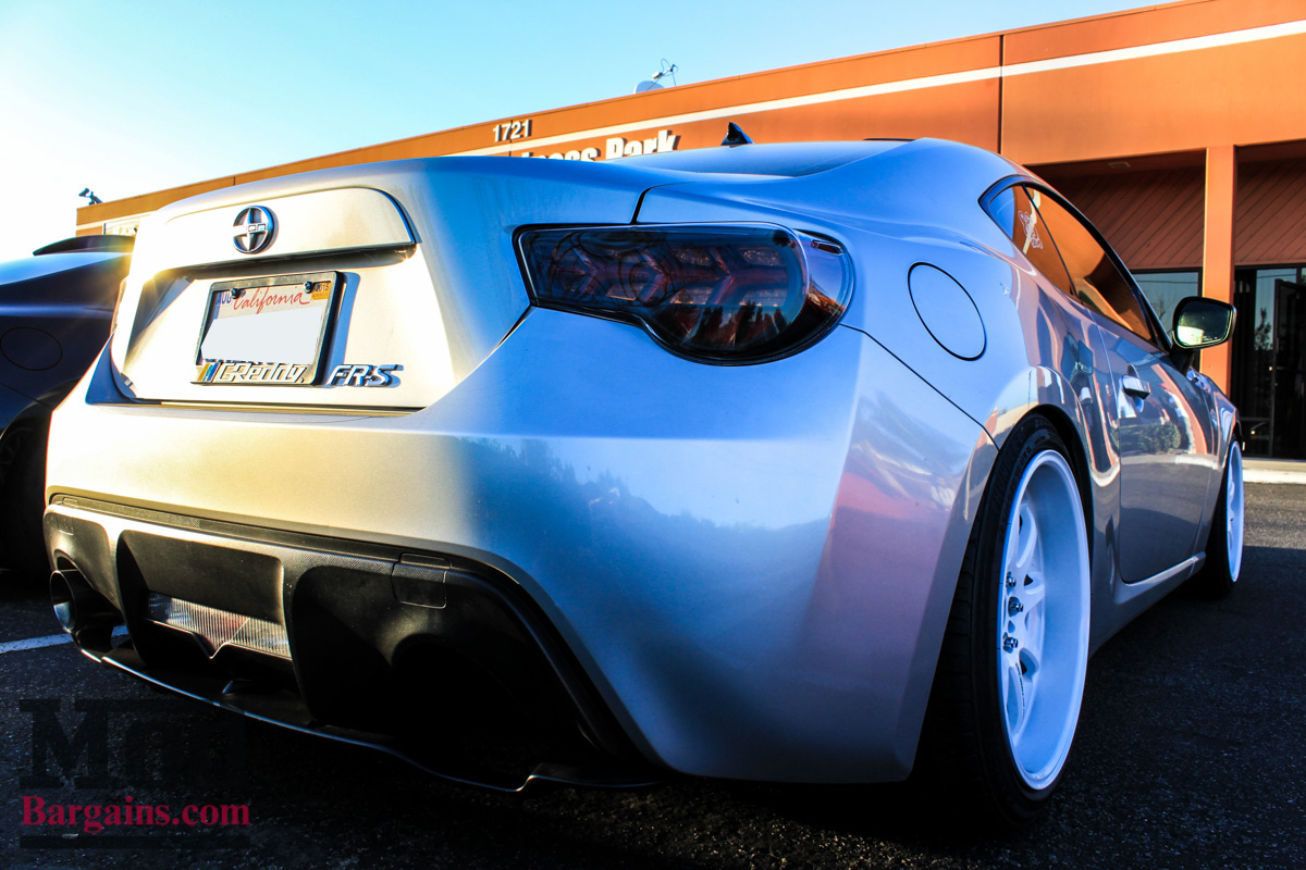This white FR-S with the FMIC peeking out of the front grille is one of the first cars to sport the Full Blown Turbo Kit for Scion FR-S/BRZ, installed right here at ModAuto. Since this was a meet focused on lighting, most of the fun stuff would happen after sunset, but some of the earliest arrivals had interesting stuff to check out, like the APR Performance Front Splitter for Scion FR-S/BRZ, which is one of the few functional aerodynamic parts available for the Toyobaru twins that actually makes real downforce.