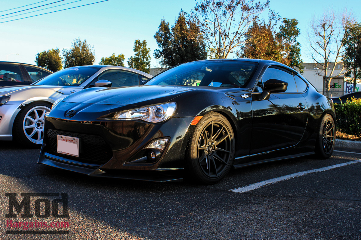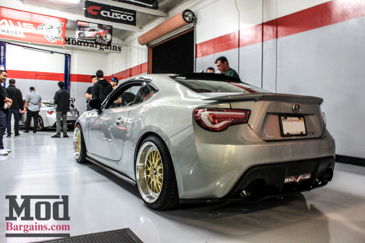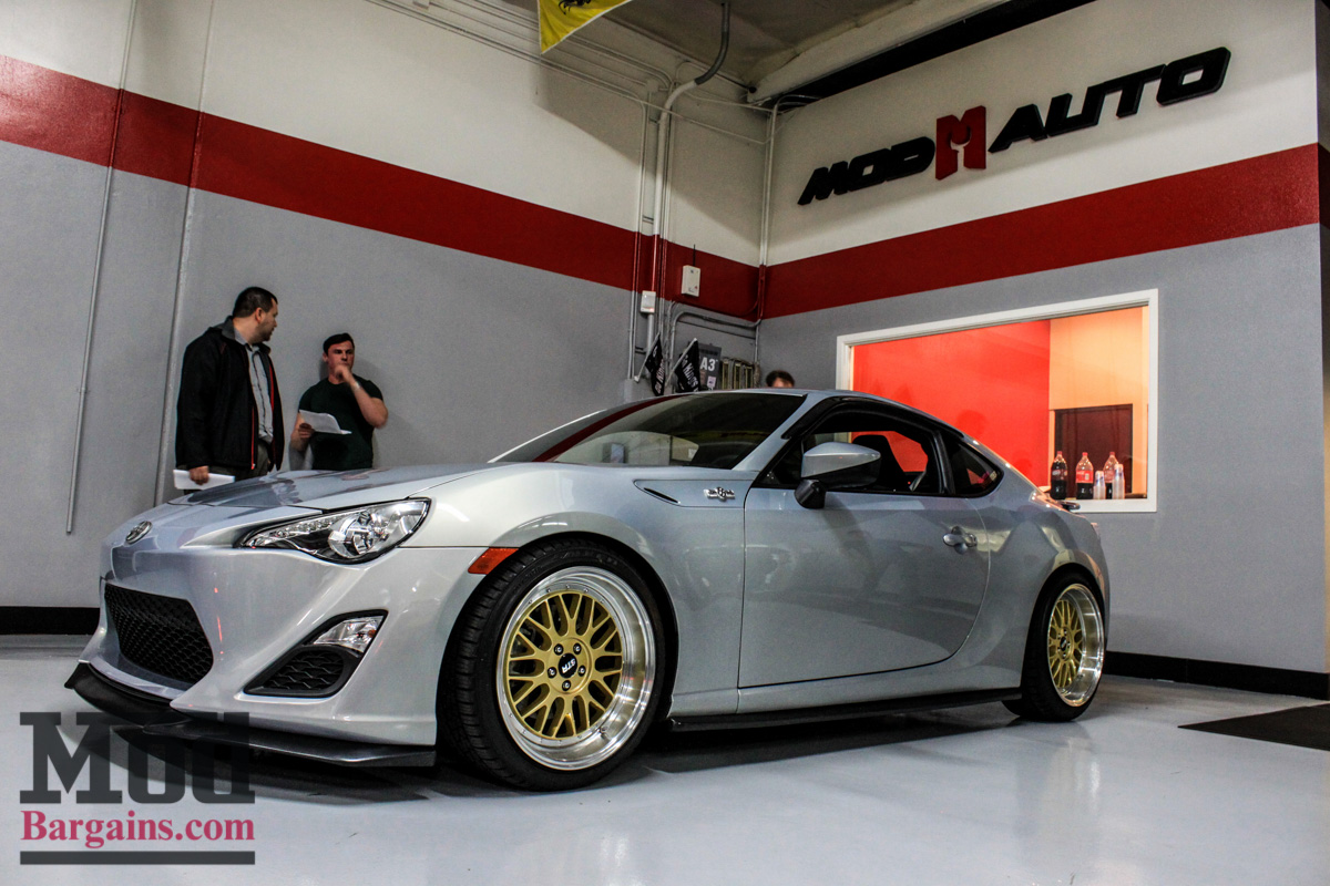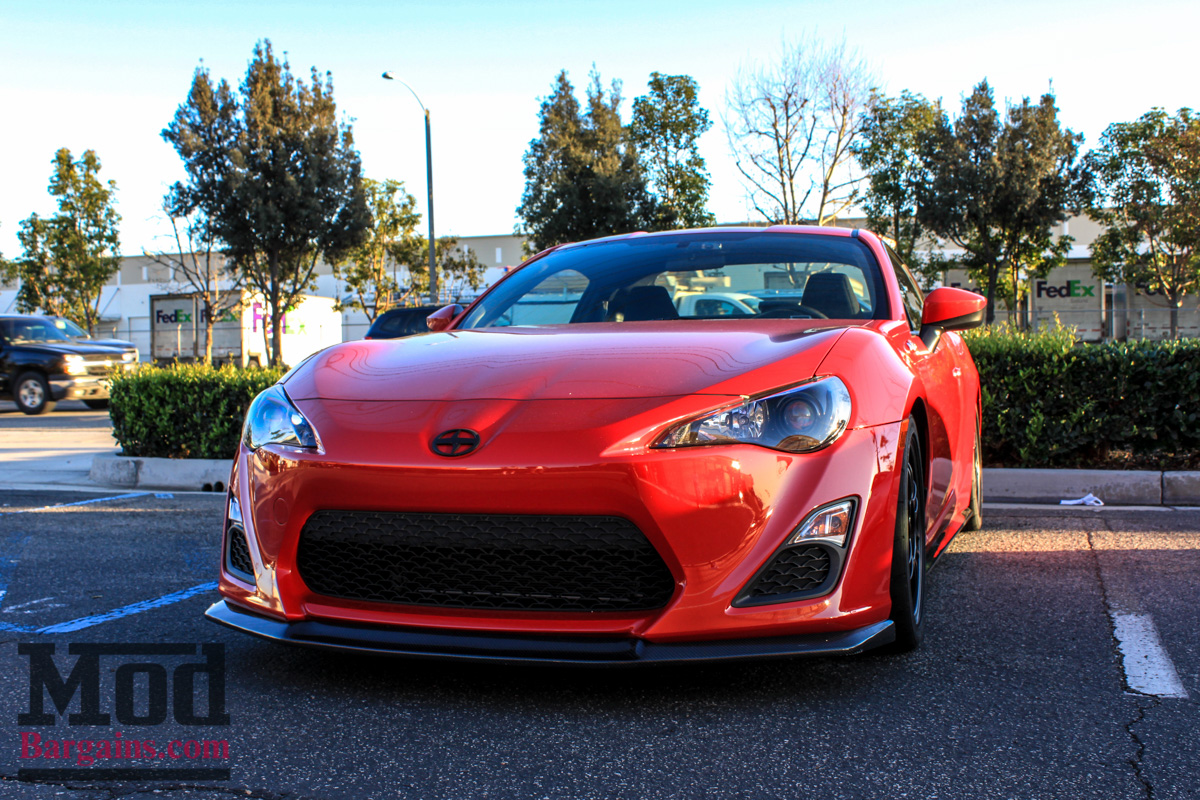 This white FR-S with the FMIC peeking out of the front grille is one of the first cars to sport the Full Blown Turbo Kit for Scion FR-S/BRZ, installed right here at ModAuto. Since this was a meet focused on lighting, most of the fun stuff would happen after sunset, but some of the earliest arrivals had interesting stuff to check out, like the APR Performance Front Splitter for Scion FR-S/BRZ, which is one of the few functional aerodynamic parts available for the Toyobaru twins that actually makes real downforce.