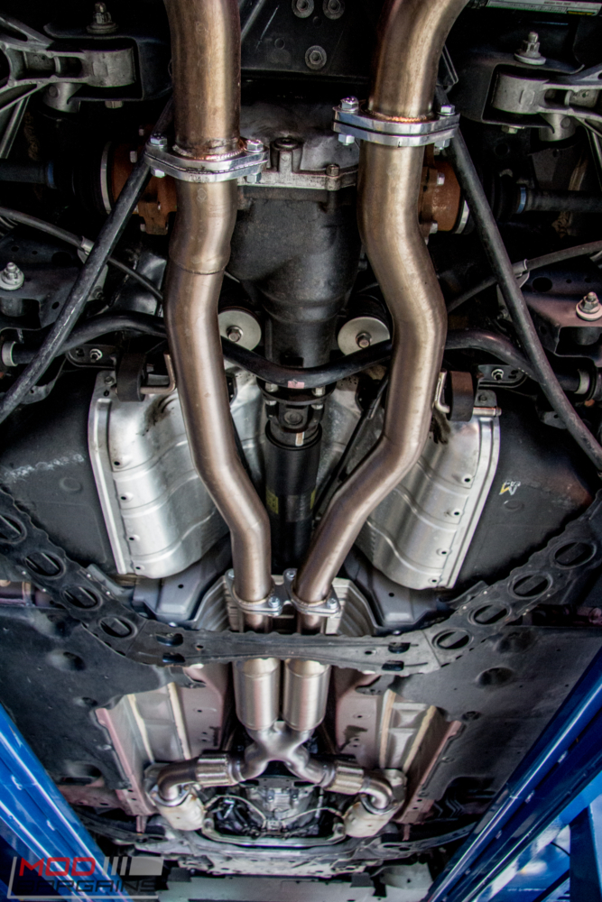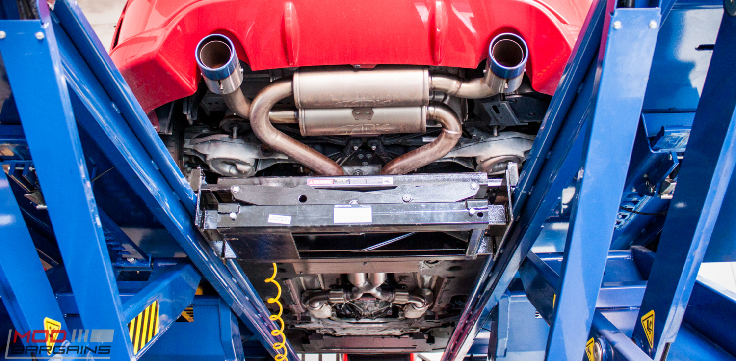 The exhaust is an ARK DT-S Exhaust for Nissan 370Z, which is a true cat-back system. The bends are very strategically placed to give this system a different sound and performance characteristics than other aftermarket exhausts for just the right engine note. Here’s the business end of the ARK DT-S Exhaust for Nissan 370Z. The Burnt Titanium finish tips really look sharp.