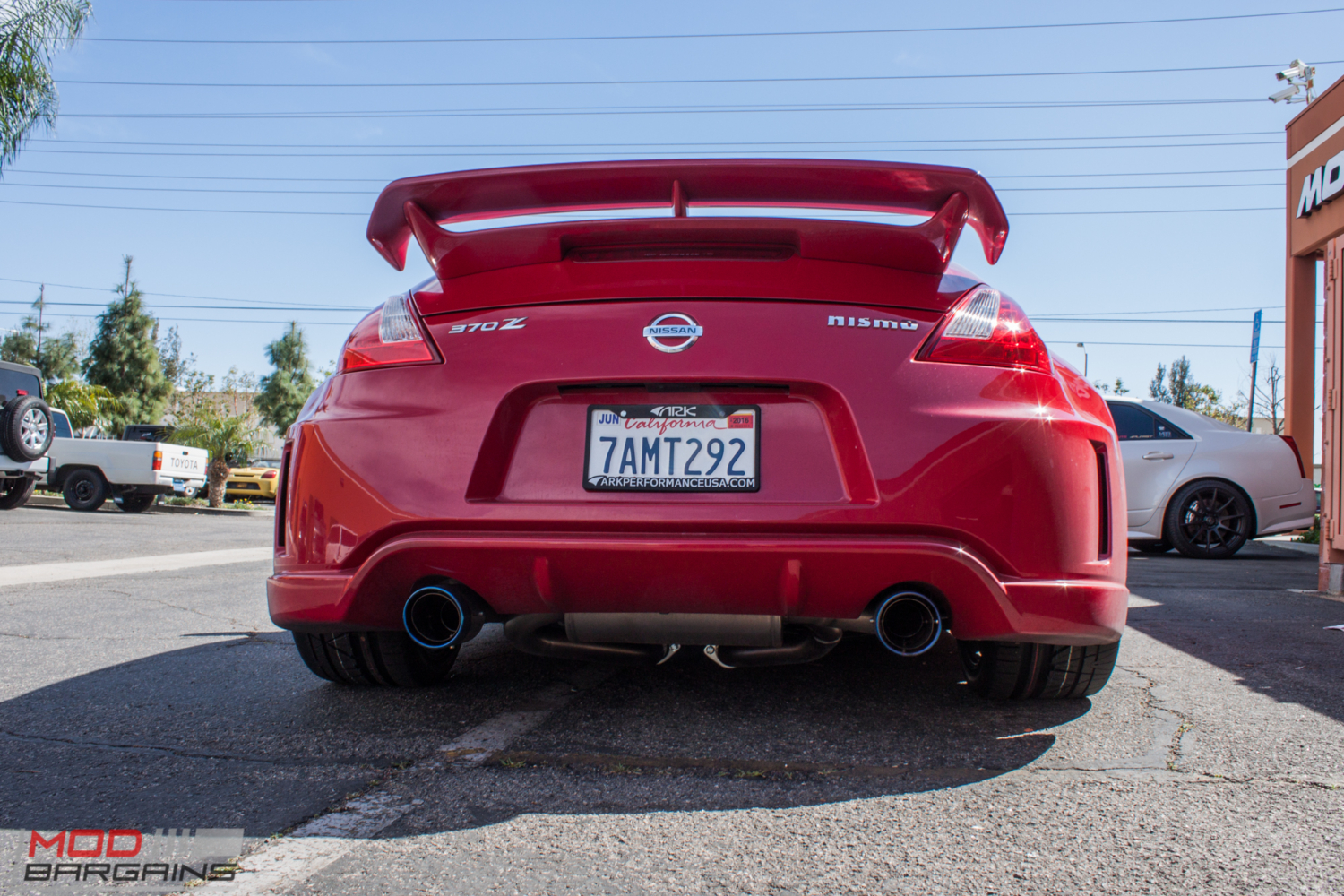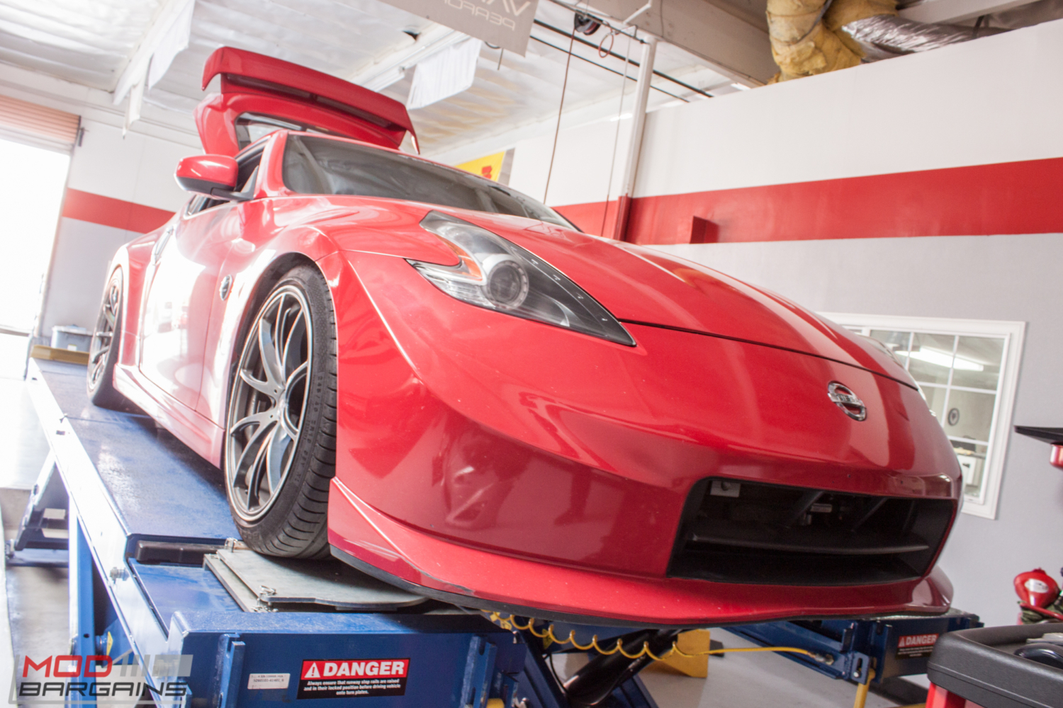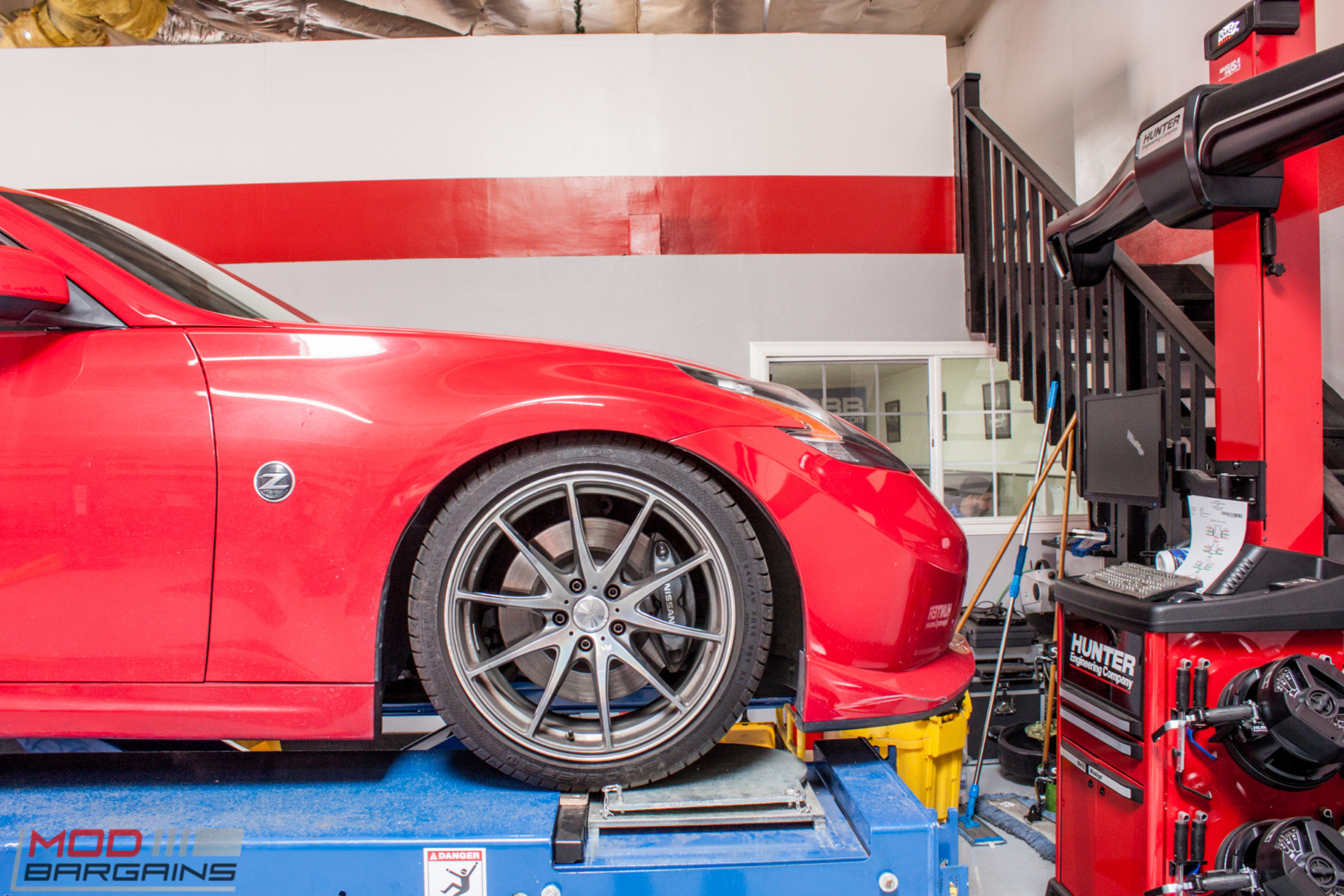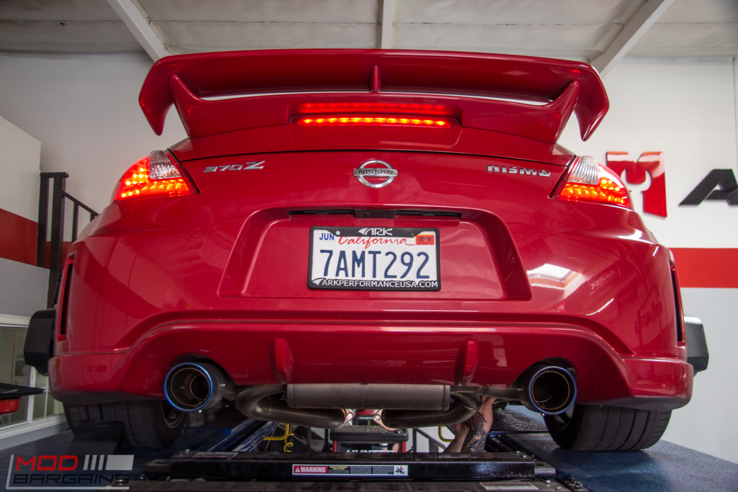 A while back, Kevin B brought in his Nissan 370Z Nismo to see Mod Expert Sean to get this Nismo Red Fairlady aligned on our flush-with-the-floor, in-ground Alignment rack. Kevin’s a friend of ours from ARK Performance, and as you might expect, the car boasts several ARK goodies.