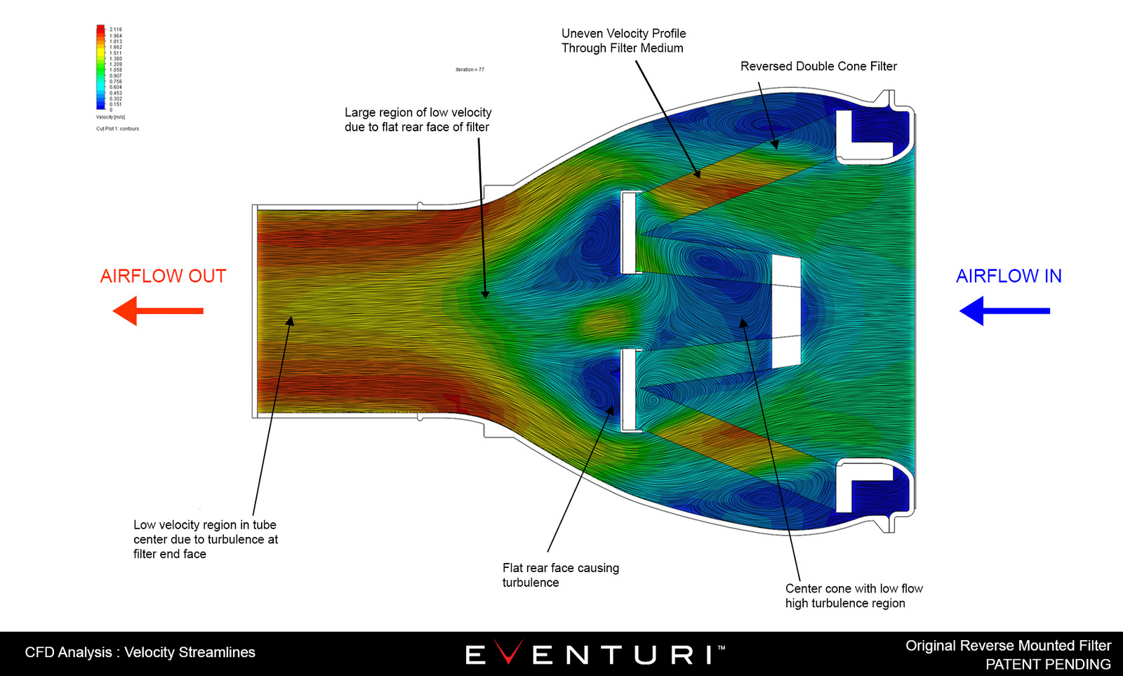 This photo clearly shows just why the original cone design would disrupt the overall airflow. Additionally, the filter medium contributed to uneven airflow through the filter as shown by the velocity profile.