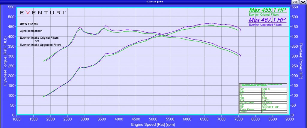 These numbers were run between the same F82 M4 application we’re reviewing from our shop. The dyno graph shows the V2 intake receives an increase of 12HP over the original design, which generated an additional 10hp over the stock F82 intake. This means that, compared to the stock air system, the 2018 Eventuri intakes now generate a gain of approx. 22hp!