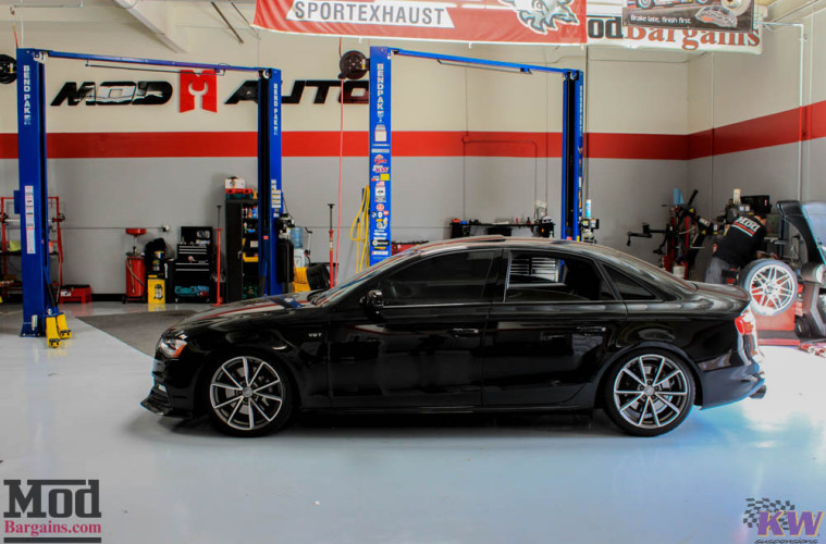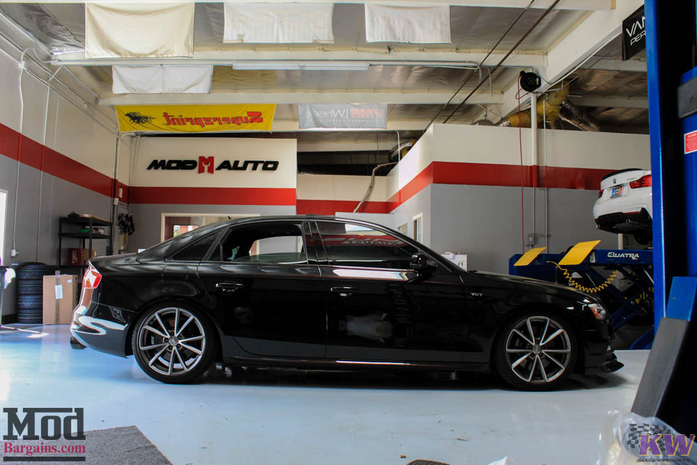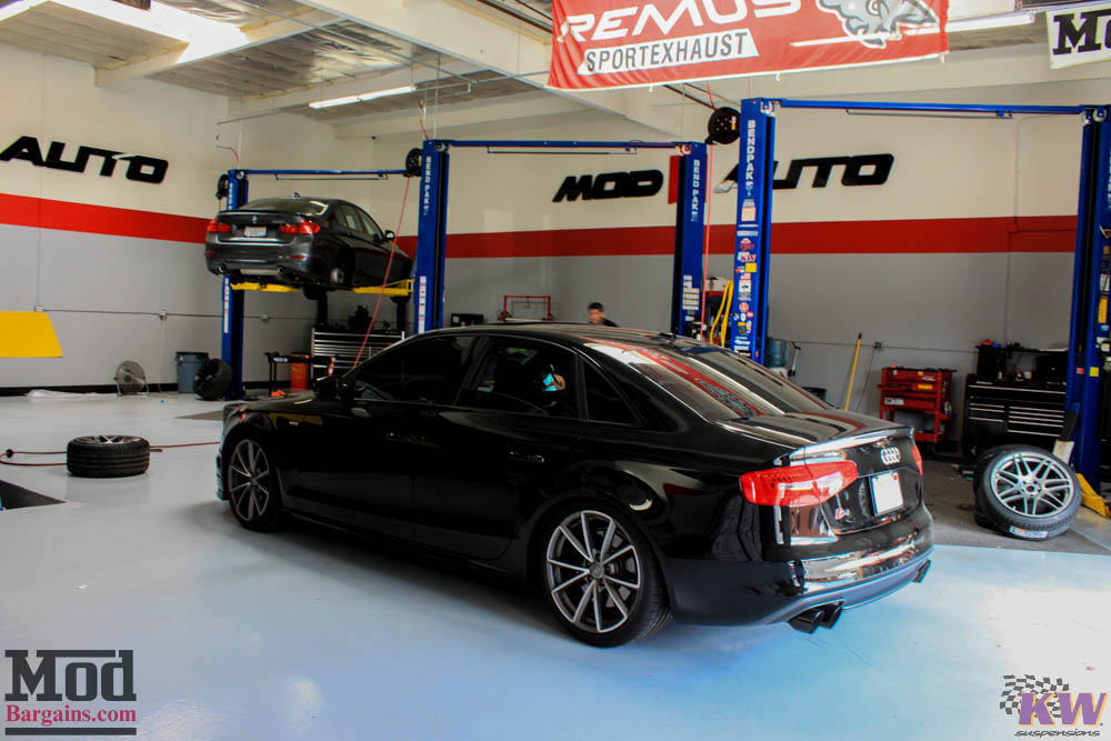 After installing the KW V3 coilovers for B8.5 Audi S4, we got the car back on the ground and the Mod Auto techs got the car set exactly where the owner had requested its ride height sit.