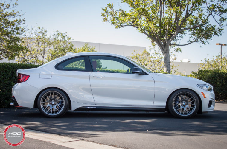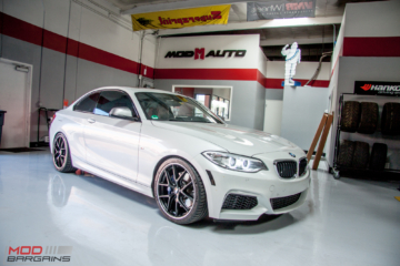 When Gary G from Sherman Oaks picked up his 2016 F22 BMW M235i, he knew the stock wheels made his car look lame and so he contacted Mod Expert Sean (714-582-3330 ext 8009) to achieve a perfect OEM Plus look. After some discussion, Sean and Gary elected some Sportline 8S wheels in Gunmetal For BMW spec’d out at 18×8.5 ET45 and 18×9.5 ET45 with some nice matching Michelin Pilot Super Sports 235/40/18 and 255/35/18. To really dial in the new M235i, Vogtland Springs and some 5mm H&R spacers were added to the order.