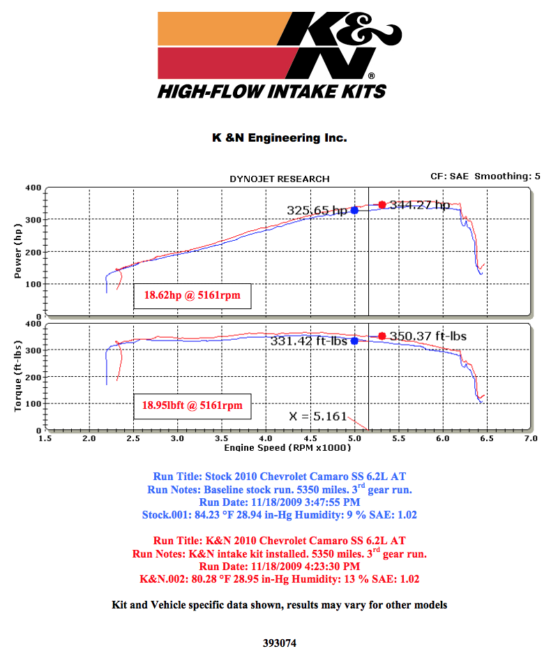 Check out the dyno chart for the intake alone above. With the enhancements in flow and elimination of the restrictive sections, the K&N intake is good for a 18hp gain and almost 19tq gain at the wheels from the intake alone- and the larger filter and heat shield will also give you a more satisfying engine note every time you stab the throttle.