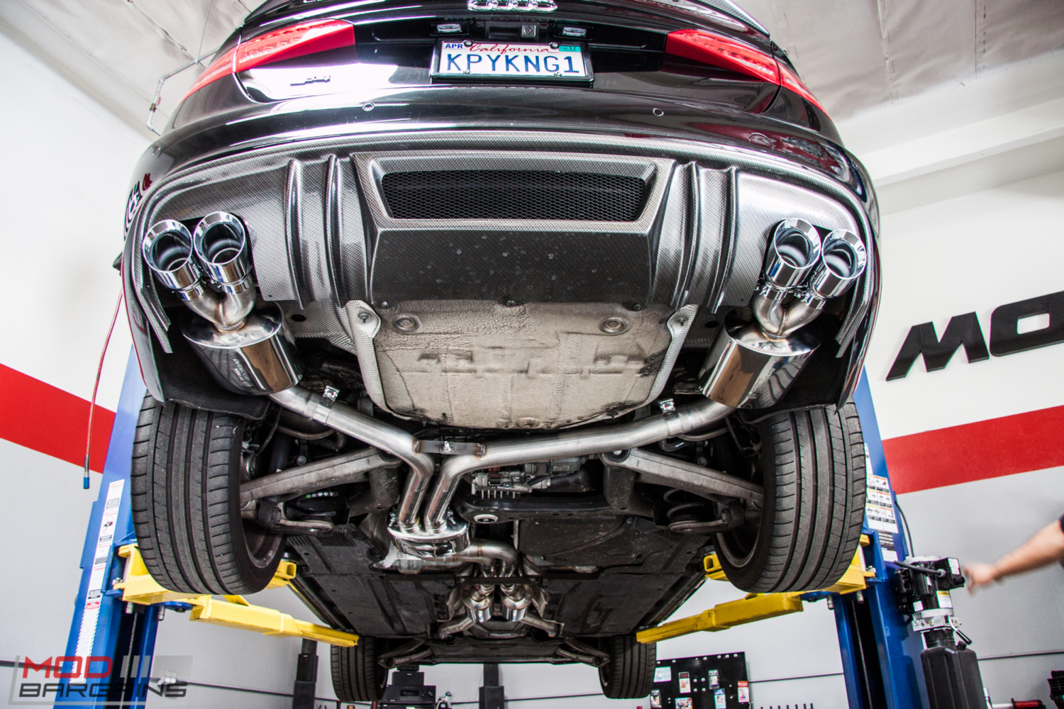 Phillip C is in the process of putting together what should be an incredible looking car when it’s finished, and short of a set of wheels, he’s there- Phillip C brought his B8 Audi S4 into Mod Auto to see Sr Mod Expert Alan to give the car’s suspension a drop and give the exhaust a more German sound. The first order of business was to install a new AWE Tuning Touring Exhaust for B8 Audi S4 to give the car more character and a tidy bump in horsepower.