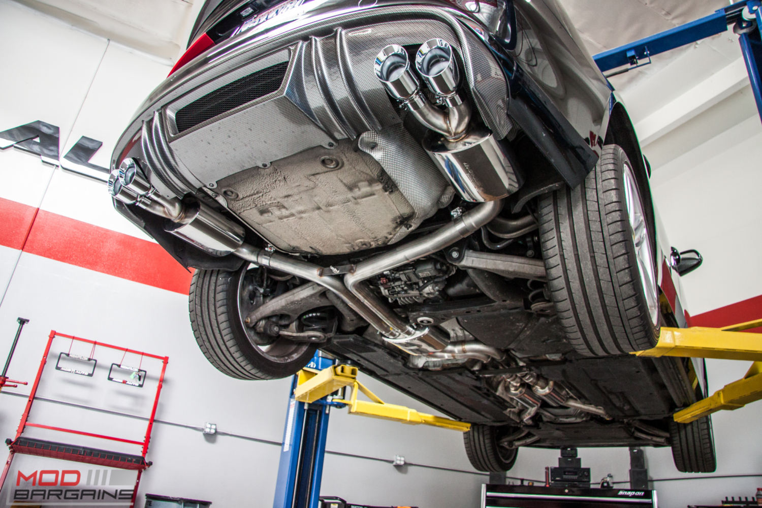 Here’s another angle of the system. In addition to the AWE Tuning Exhaust, we also installed a set of H&R Sport Springs for Audi B8 S4 to drop the ride height just a bit and get rid of the excess wheelgap.
