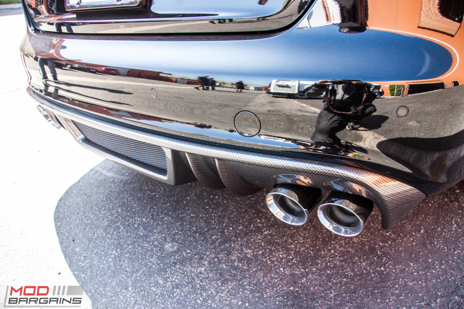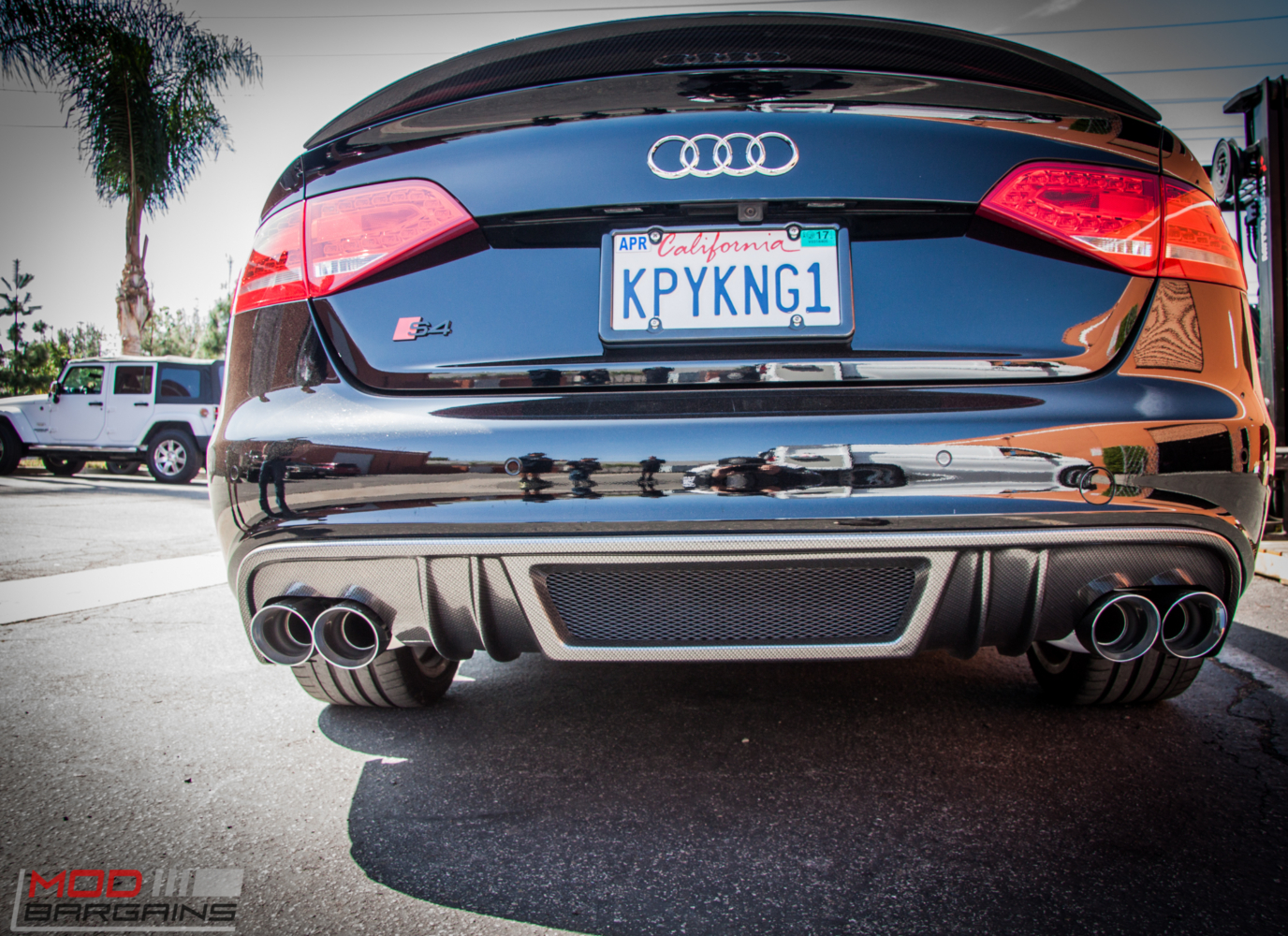 of this exhaust system, which sounds incredible on the S4 without any obnoxious drone. The car already sports a R-Style Carbon Fiber Rear Diffuser for B8 Audi S4 and the quad AWE Tuning polished exhaust tips are an excellent fit for its character.