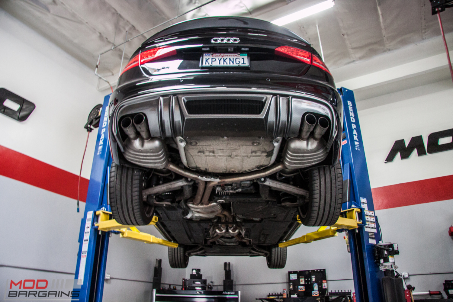 Phillip C is in the process of putting together what should be an incredible looking car when it’s finished, and short of a set of wheels, he’s there- Phillip C brought his B8 Audi S4 into Mod Auto to see Sr Mod Expert Alan to give the car’s suspension a drop and give the exhaust a more German sound. The first order of business was to install a new AWE Tuning Touring Exhaust for B8 Audi S4 to give the car more character and a tidy bump in horsepower.