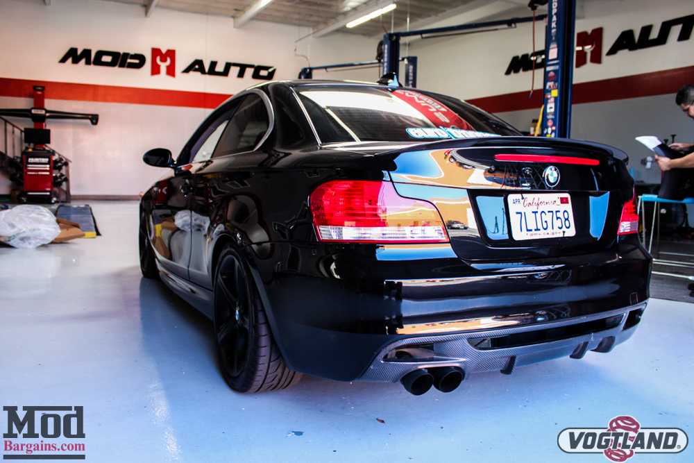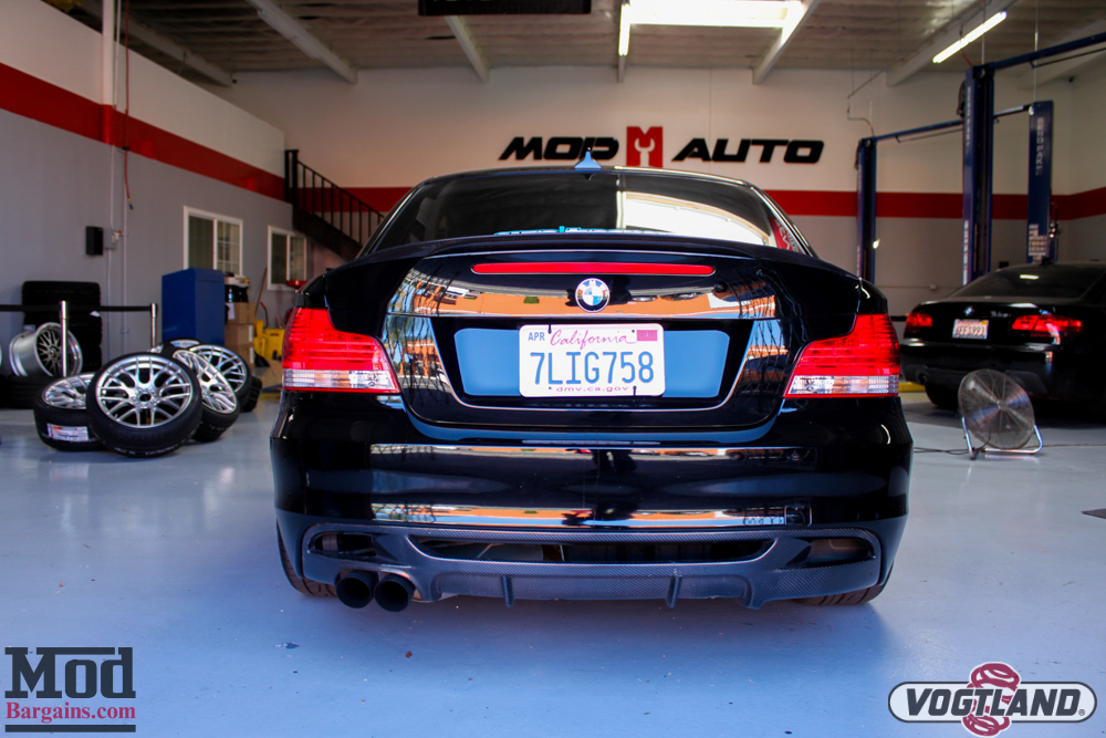 BMW_E82_135i_Black_Vogtland_Coilovers-6 We got the 1-series back on the ground and started dialing in the ride height of the 1-Series suspension.BMW_E82_135i_Black_Vogtland_Coilovers-9 BMW_E82_135i_Black_Vogtland_Coilovers-11 From the side profile, the stance of the car looks great.BMW_E82_135i_Black_Vogtland_Coilovers-12 A few E82 Exterior mods also give the back end of the car a unique character. A Carbon Fiber Performance Style Rear Diffuser sets off the black exhaust tips, and the body-color Trunk Spoiler for E82 1-Series looks quite nice with the pairing. BMW_E82_135i_Black_Vogtland_Coilovers-14Here’s another angle of how the car sits.