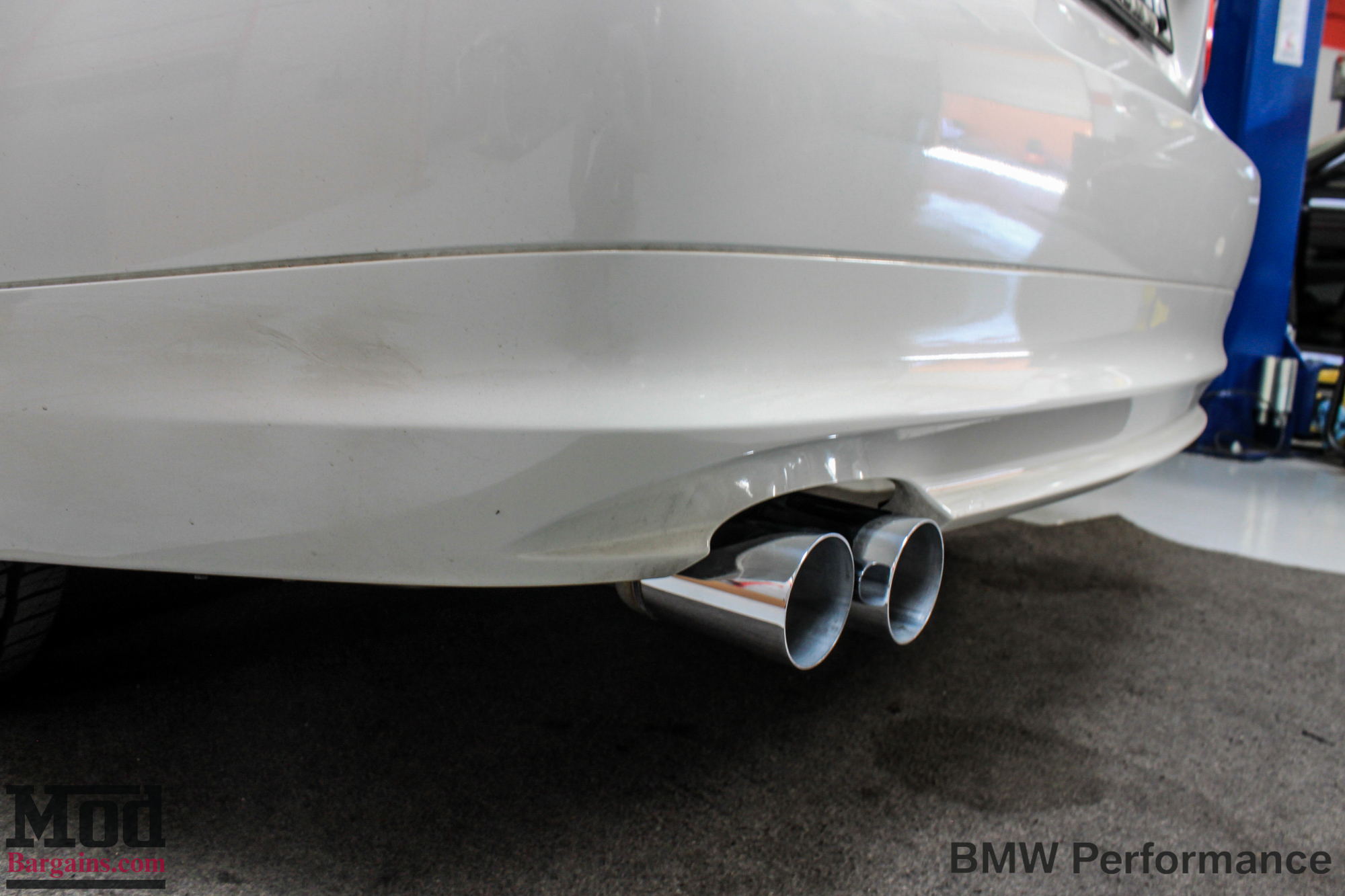 BMW_E90_328i_White_BMW_Performance_Exhaust_Only-8 The bright polished BMW Performance exhaust tips are not only larger but the bright finish takes years off the look of this E90.BMW_E90_328i_White_BMW_Performance_Exhaust_Only-9 Stepping further back, you can really appreciate the visual impact of the system.BMW_E90_328i_White_BMW_Performance_Exhaust_Only-10 Here’s the low-angle view of how it all went together.