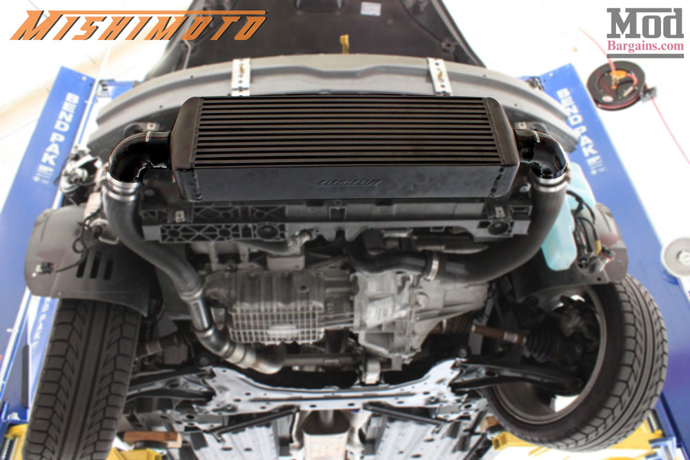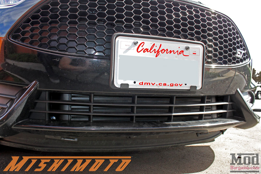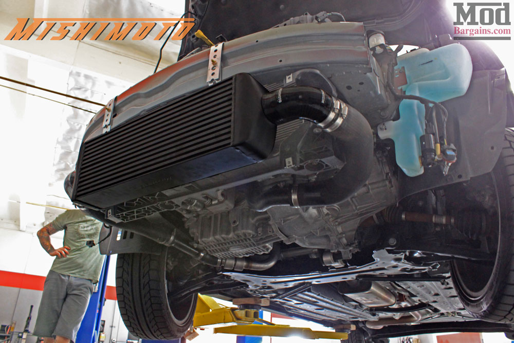 The black powdercoated finish of the Mishimoto J-line FMIC blended in well and disappears behind the OEM lower grille for a stealthy look.