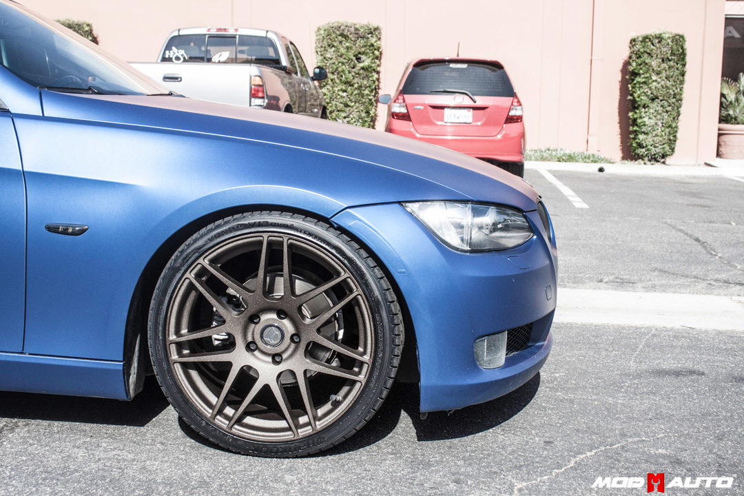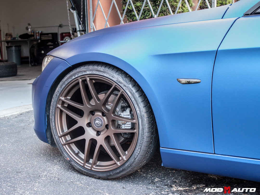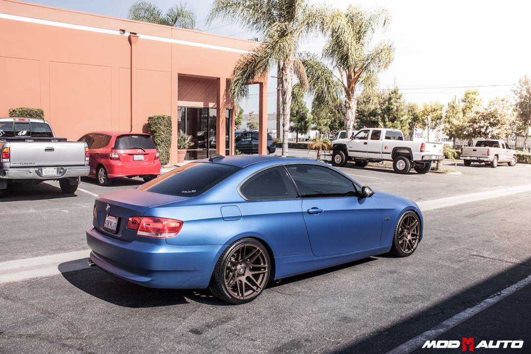 The oil rubbed bronze offers a brilliant contrast against the car’s Frozen Blue matte finish, and makes the car ‘pop’ visually. Of course, this E92 Coupe is lowered as well, courtesy of a set of H&R Springs to drop the E92 Suspension.